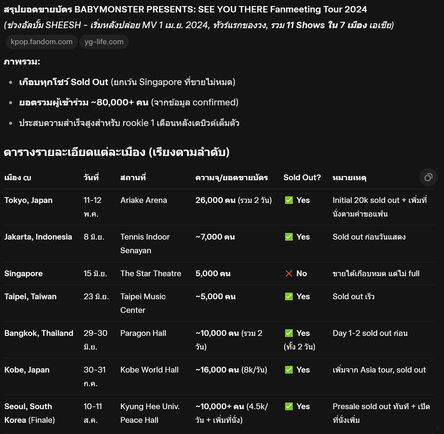 จากข้อมูลด้านบน จะเห็นได้ว่า Babymonster ก็กลับมาทำผลงานได้ตามที่หลายคนคาดหวัง และบางทีก็อาจจะเกินกว่าที่หลายคนคาดไว้เช่นกัน สำหรับความสำเร็จที่มากขนาดนี้ และการเปิดตัวที่ดีขึ้นมากนี้ ก็ส่งผลให้ค่ายเพิ่มประสบการณ์ใหม่ด้วยการทัวร์คอนเล็กๆ ที่เรียกว่า Fan Meet ซึ่งก็เห็นกันชัดๆ ว่ามันคือ Mini Concert ชัดๆ และก็ประสบความสำเร็จมาก สำหรับวงที่เดบิ้วได้หนึ่งเดือนนิดๆ แต่กลับสามารถทัวร์ Fan Meet ใน Scale ที่ใหญ่พอสมควรเลย โดยเฉพาะที่ญี่ปุ่นคนเข้าไปดูเยอะมาก เป็นหลักฐานสำคัญว่าฐานแฟนคลับในญี่ปุ่นของ BM มีเยอะมากจริงๆ