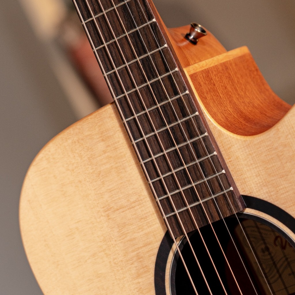 วัสดุคือหัวใจของโทนเสียง ไม้หน้า Solid Sitka Spruce ตอบสนองเร็ว สมดุล และถ่ายทอดรายละเอียดของโน้ตได้ชัดเจน เล่นได้ทั้ง fingerstyle และ strumming อย่างครบถ้วน ด้านข้างและหลังใช้มะฮอกกานี ช่วยเพิ่มความหนาแน่นและความอุ่นของเสียงโดยรวม คอทำจากมะฮอกกานี ฟิงเกอร์บอร์ดและบริดจ์เป็นโรสวูด ให้สัมผัสนิ้วลื่นและเป็นธรรมชาติ นัท–แซดเดิลจาก Graph Tech NuBone ถ่ายทอดแรงสั่นสะเทือนได้อย่างมีประสิทธิภาพ ทำให้โน้ตคมชัดตั้งแต่ย่านต่ำจนถึงย่านสูง