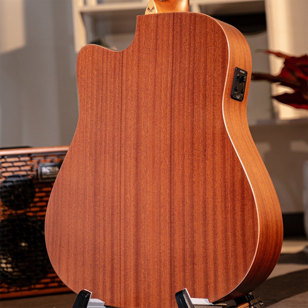 บอดี้ทรงเดรดนอตพร้อมคอเว้า (Dreadnought Cutaway) ให้เสียงเต็ม แน่น และเข้าถึงเฟรตบนได้สะดวก ไม้หน้าเป็น Solid Sitka Spruce (ไม้หน้าแท้) ให้โทนกลางชัด โปร่ง สดใส และจะ “เปิดเสียง” นุ่มนวลขึ้นตามเวลา ส่วนไม้ข้าง–หลังเป็นมะฮอกกานี เพิ่มความอุ่นและมิติของเสียง เหมาะทั้งการดีดคอร์ดแรง ๆ และการเล่นเมโลดี้ที่ต้องการรายละเอียด