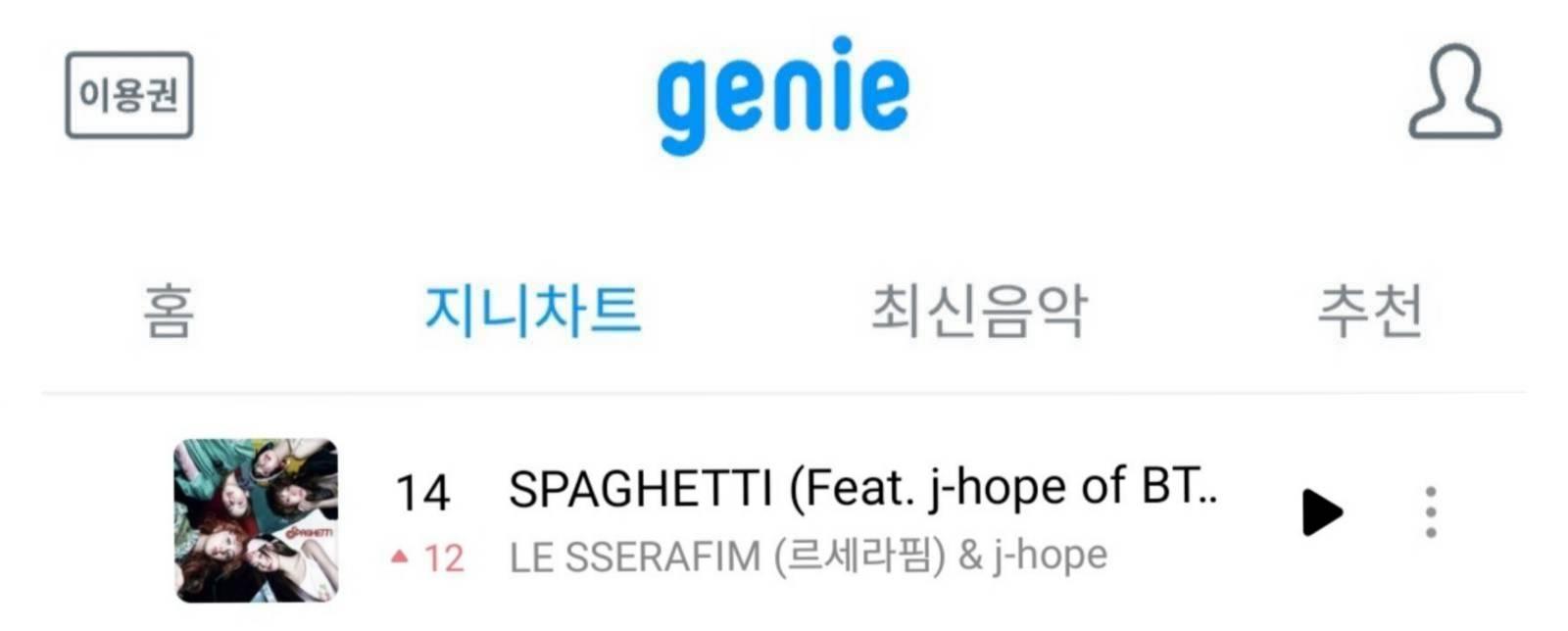 LE SSERAFIM “SPAGHETTI (feat. j-hope of BTS)” 12AM KST Update: #2 Bugs (=) #4 Melon (+1) *new peak*#10 Flo (+1) *new peak*#30 Genie (+1)
