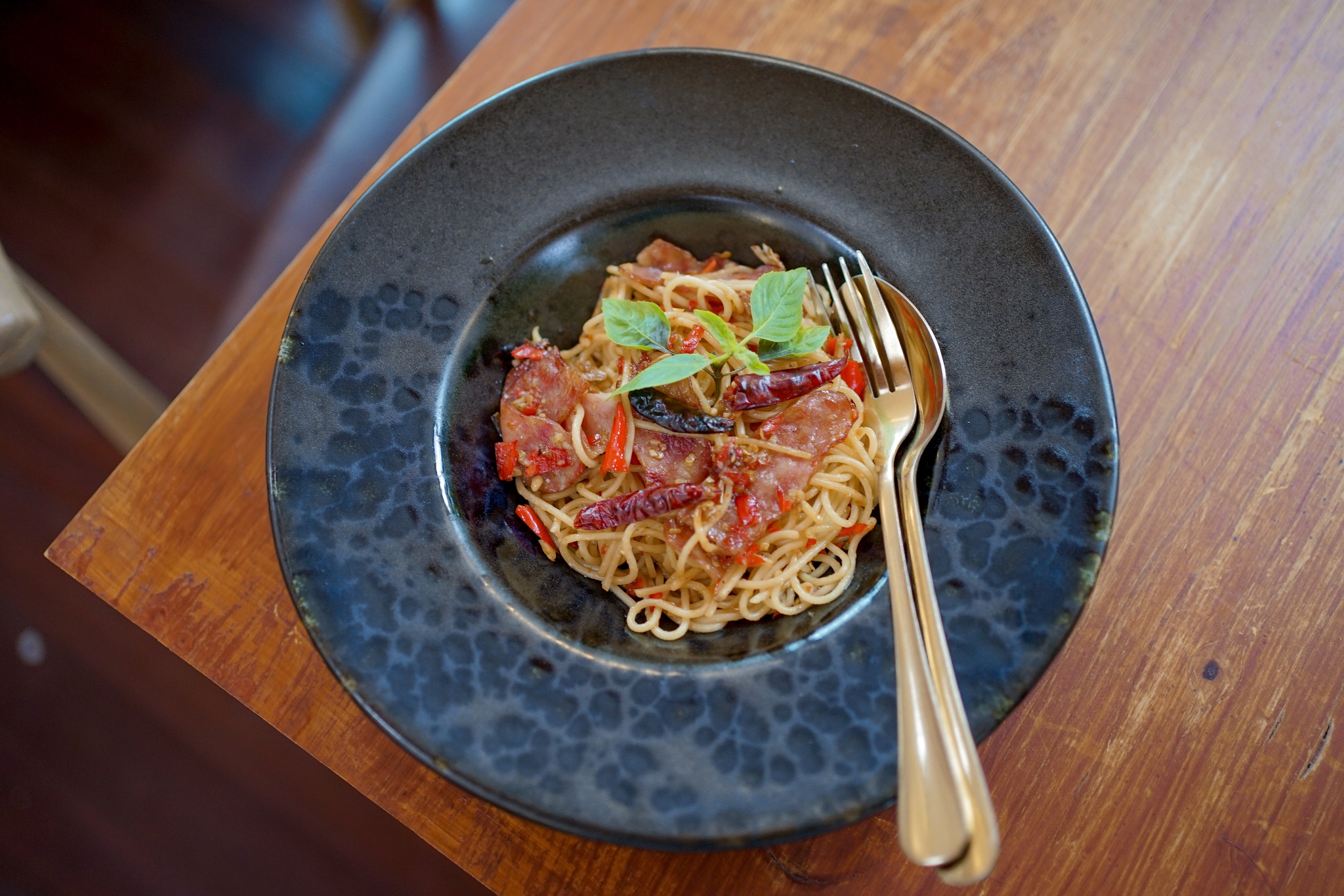 🍝🥓 สปาเก็ตตี้พริกแห้งเบค่อน 125฿