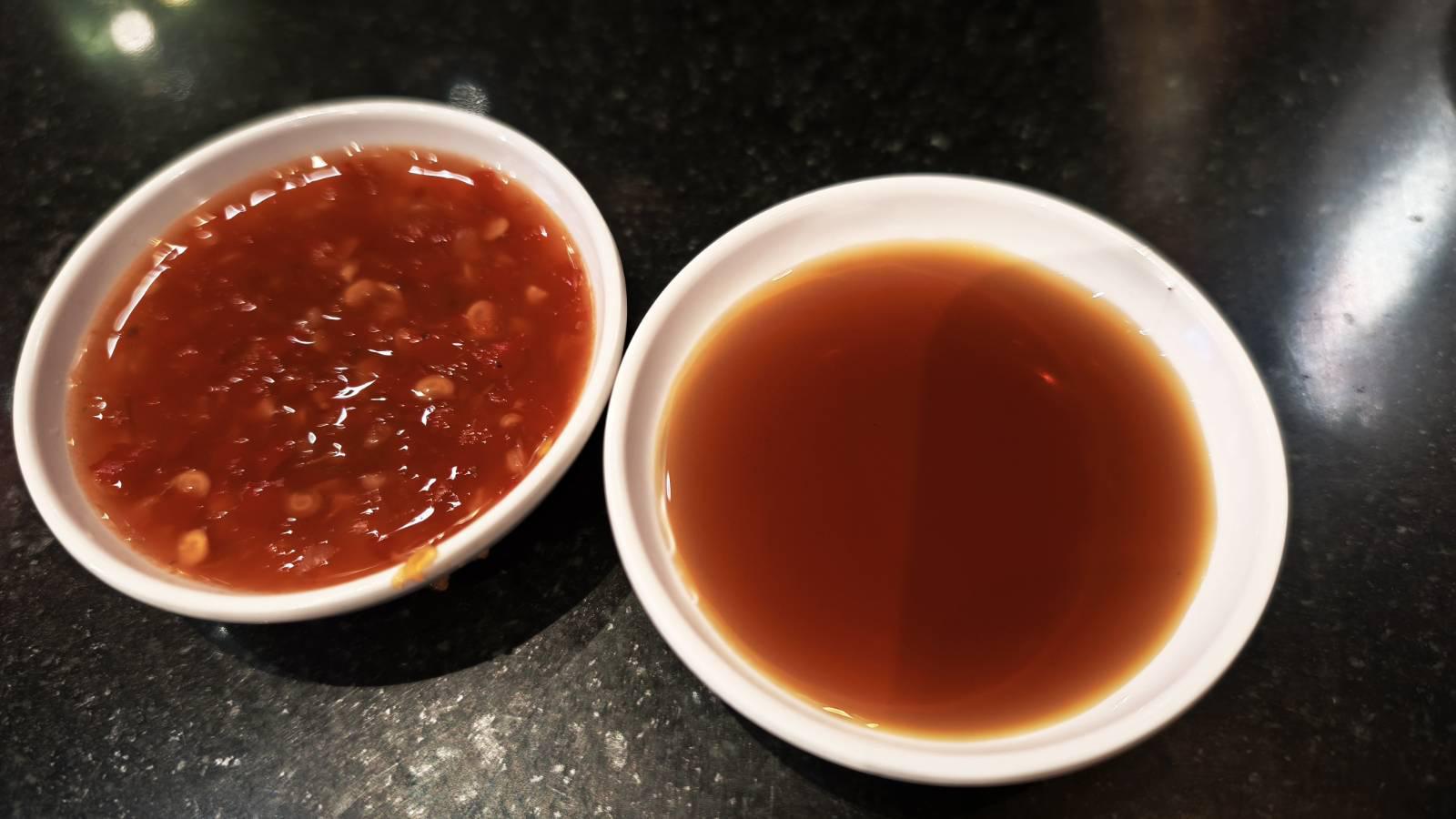 น้ำจิ้มให้มา 2 แบบ คือจิ๊กโฉ่ และน้ำส้มพริกดอง รสจัดจ้าน