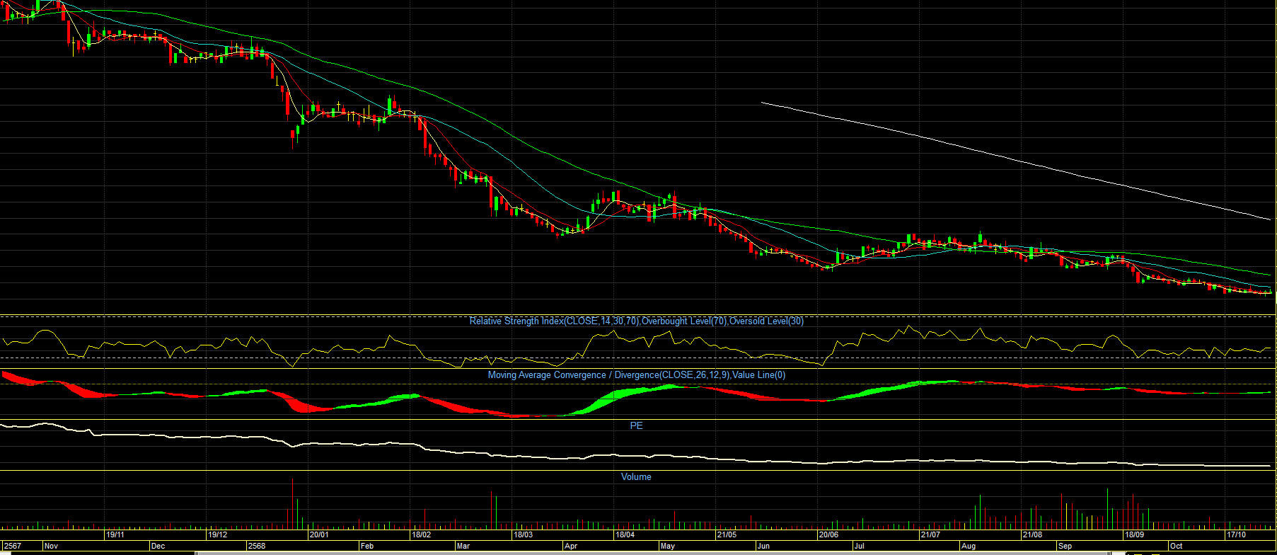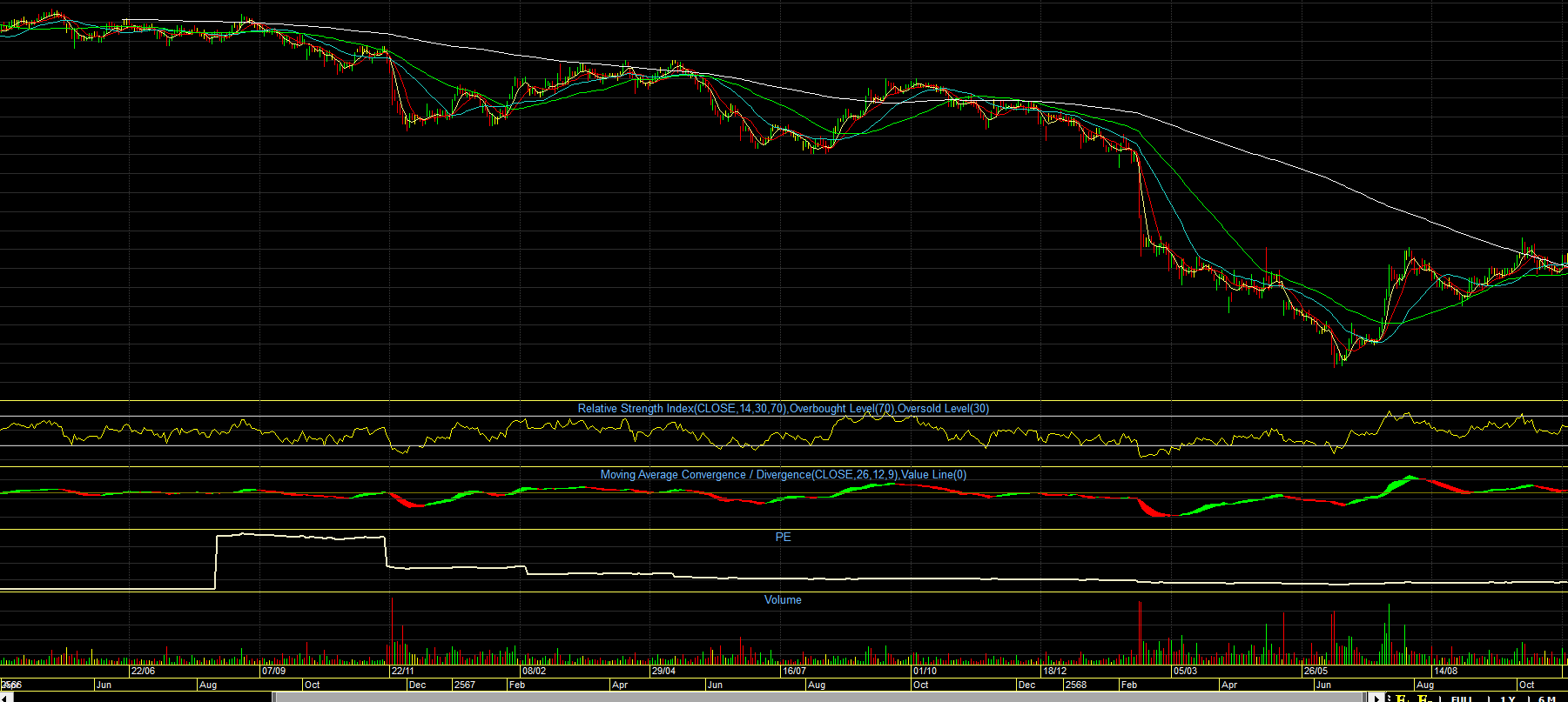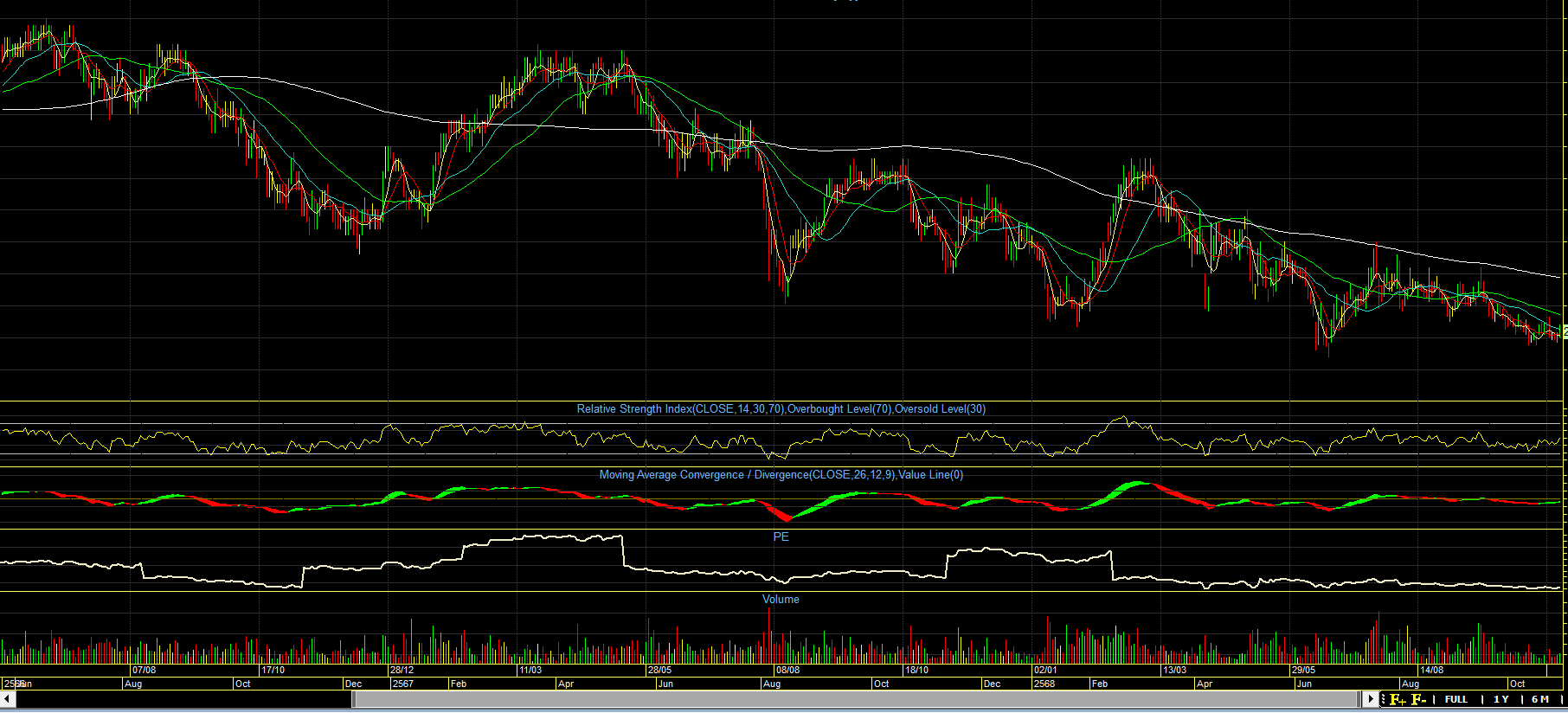 ถ้าเจอแบบ สองภาพนี้  ให้อยู่ห่าง ๆ  ไม่สามารถขึ้นไปยืนเส้น 200 ได้เลย  ขึ้นไปไม่นานก็หล่น  หรือภาพล่าง  แค่เส้น 50  ก็ยาก  แต่เทรดได้สั้น ๆ  พอ macd  ตัดลงก็ขายไป  ส่วนภาพล่างมีแรงพยายามสู้อยู่พักหนึ่ง ดูจาก  vol  แต่สู้ไม่ไหว ก็ยอมคัทลอสออกไป เลิกสู้ ไหลลงต่อ  ตัวนี้น่าติดตาม  ลงที่ยาวนาน  ขึ้นเมื่อไรก็ยาวนานด้วย  รอการกลับตัว...
