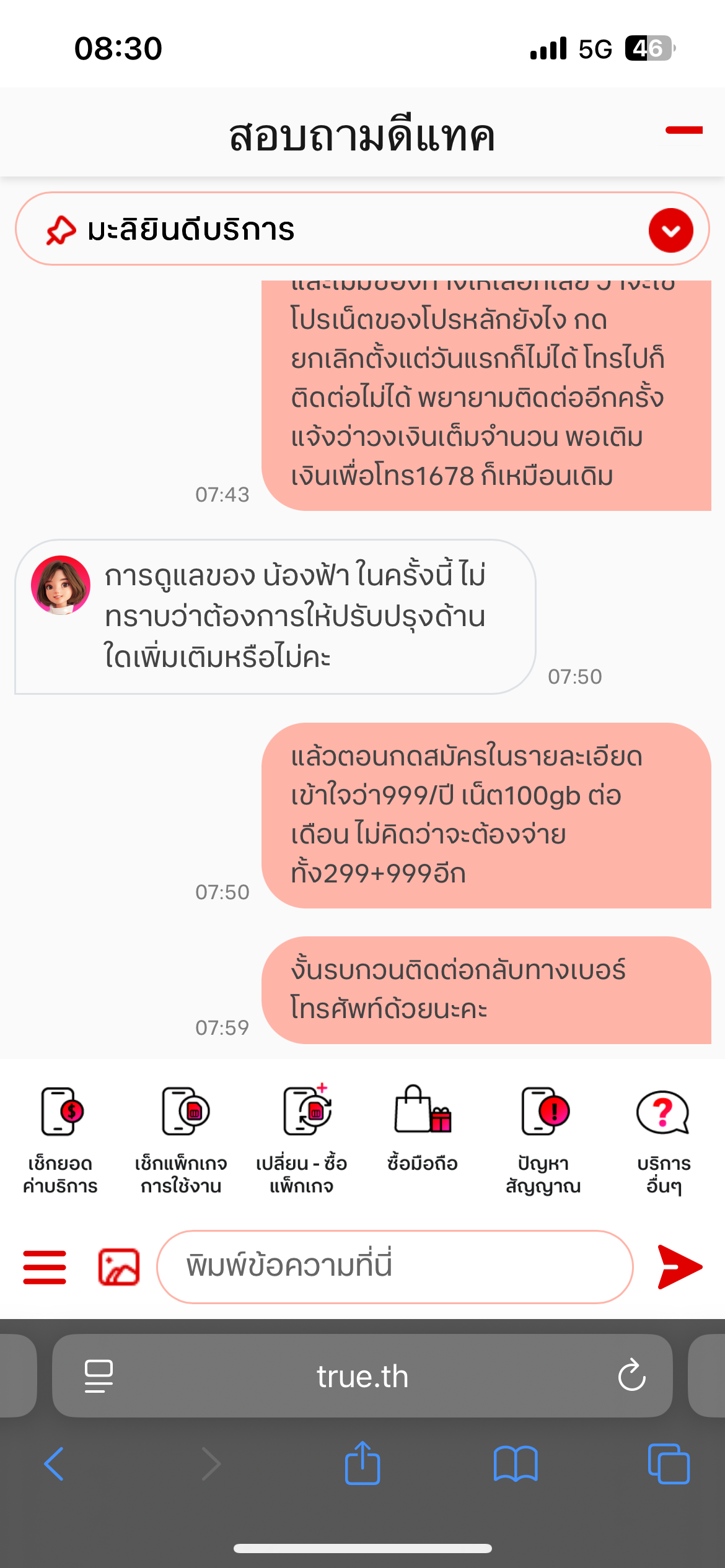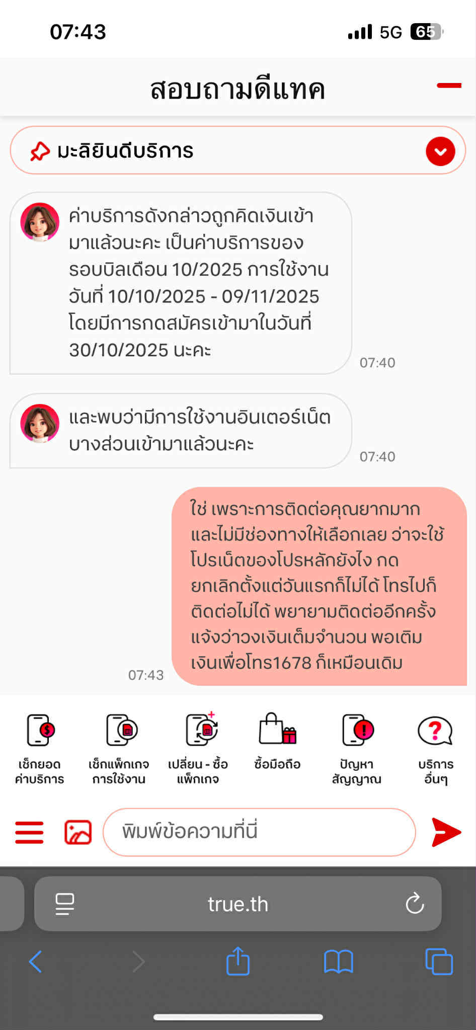 เมื่อกดยังเลิกไม่ได้ก็ไม่รู้จะทำยังไงเลยไปปรึกษาน้องที่ทำงาน น้องเลยแนะนำให้คุยกับแชทบอทของดีแทควันนี้ได้คำตอบตามภาพค่ะ