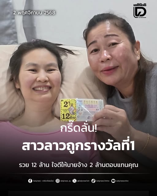 สาวลาวกรี๊ดลั่น.. ถูกรางวัลที่ 1 รวย 12 ล้าน ยกให้นายจ้างหญิงป่วยติดเตียง 2 ล้าน เพื่อตอบแทนบุญคุณ เงินที่ได้จะเอาไปใช้หนี้ปิดบ้านรถที่ประเทศลาว และกลับมาอยู่ไทยดูแลนายจ้างต่อไป