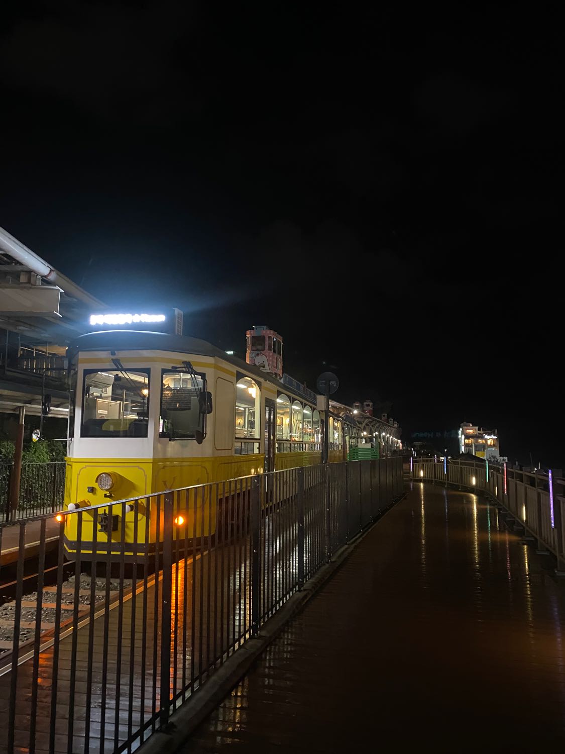 ท้องอิ่ม ฝนหยุด ก็ไปกันต่อ แต่ฟ้ามืดแล้ว ภาพจากรีวิว มีรถไฟวิ่ง ตัดกับท้องฟ้าและทะเล เปลี่ยนเป็นเพียงภาพรางรถไฟที่เงียบเหงา