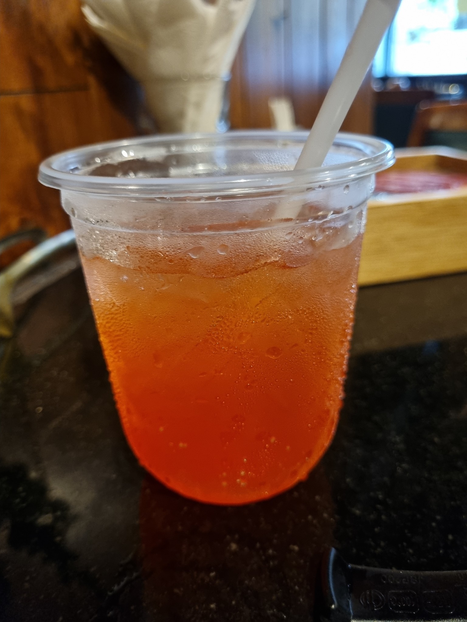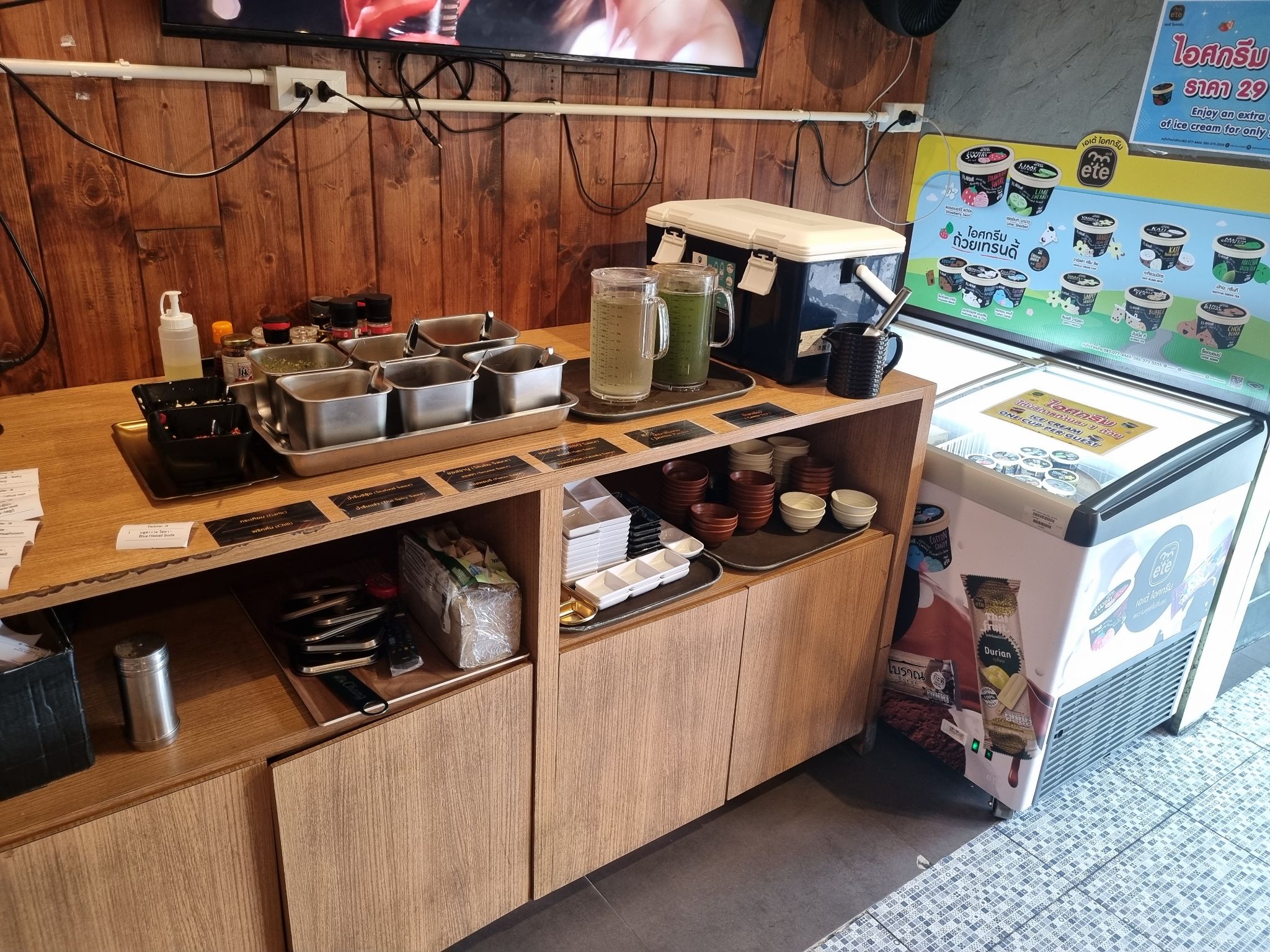 น้ำจิ้ม กับ พวกน้ำชา บริการตนเองได้ที่หน้าร้าน ไอศครีมฟรีถ้วยแรก ถ้วยต่อไป 29 บาทครับ ส่วนอย่างอื่นที่ไม่อยู่ในภาพนี้ สั่งด้วยคิวอาร์