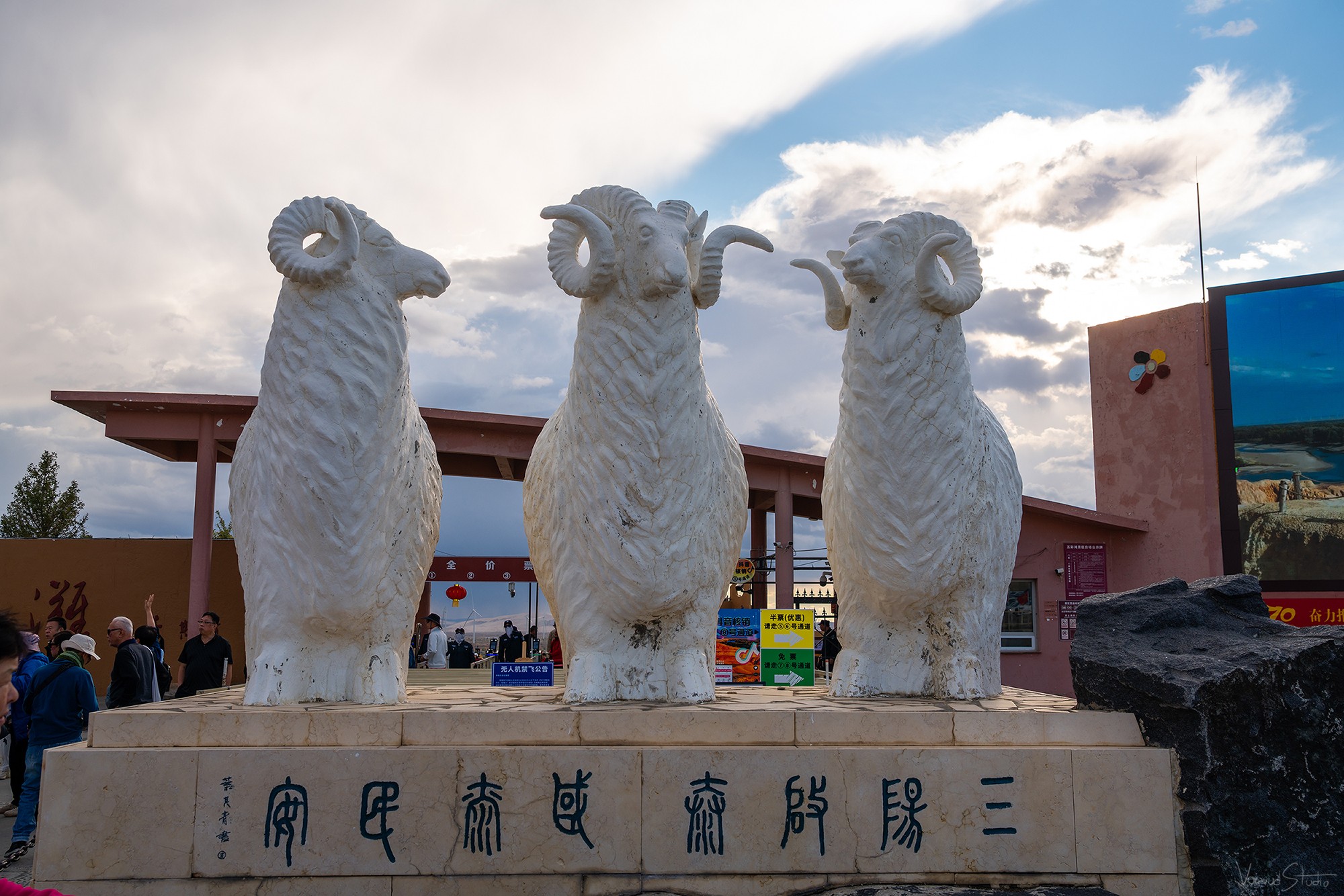 หลังจากเดินเข้าไปและซื้อตั๋วแล้ว เราจะเห็นรูปปั้นแพะภูเขาสามตัวอยู่ด้านหน้า พร้อมสลักสำนวนจีนว่า สามแพะนำโชคดีมา” หรือ “เริ่มต้นฤดูใบไม้ผลิที่รุ่งเรือง” ซึ่งมาจากแนวคิดโบราณของจีนว่า เมื่อเข้าสู่ “ฤดูใบไม้ผลิ” (ช่วงเดือน 1 ตามปฏิทินจันทรคติ) เป็นจุดเริ่มต้นของความอบอุ่นหลังจากความหนาวของฤดูหนาว ตัวอักษร “羊” (แพะ) พ้องเสียงกับ “阳” (หยาง – ความสว่าง/พลังบวก)