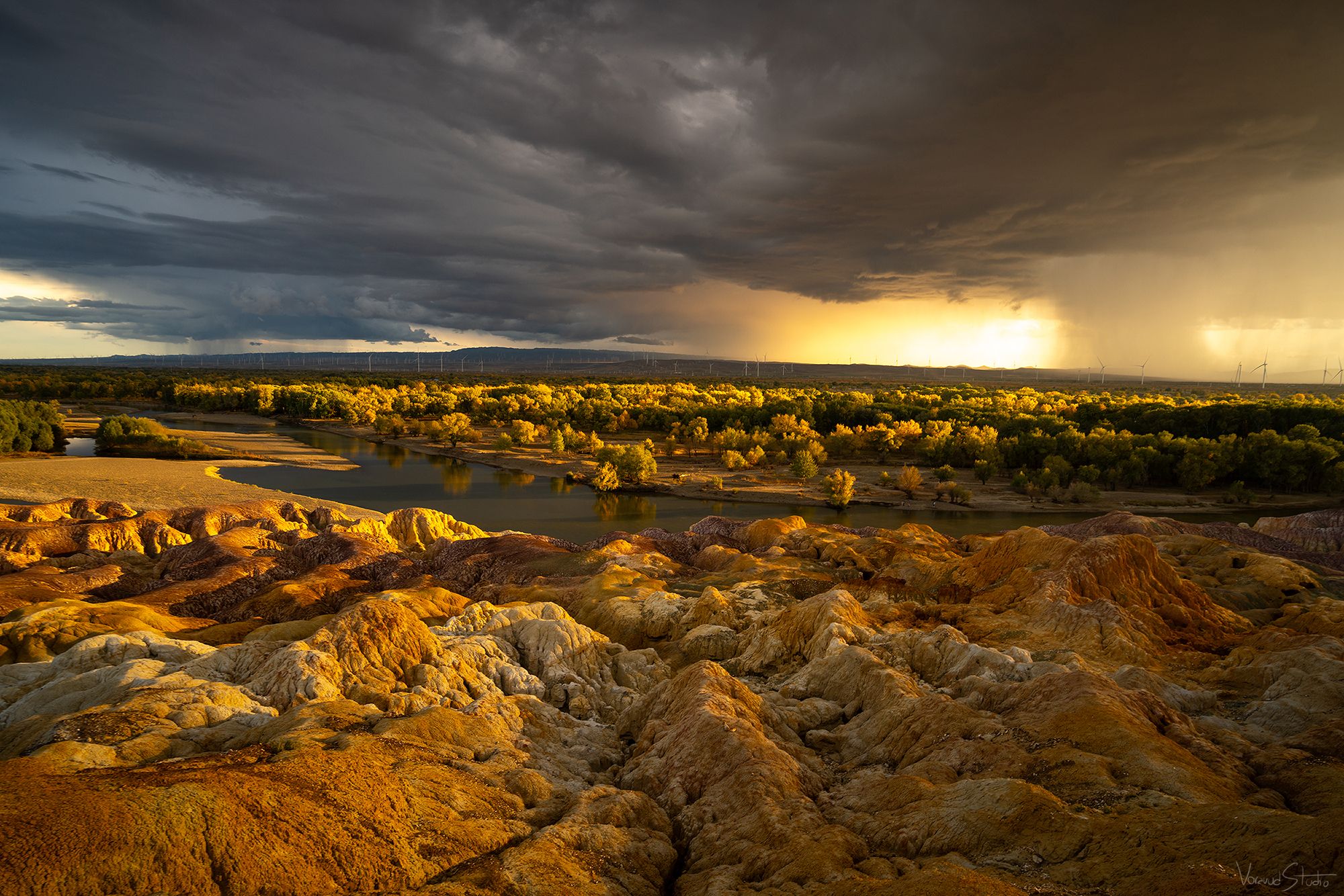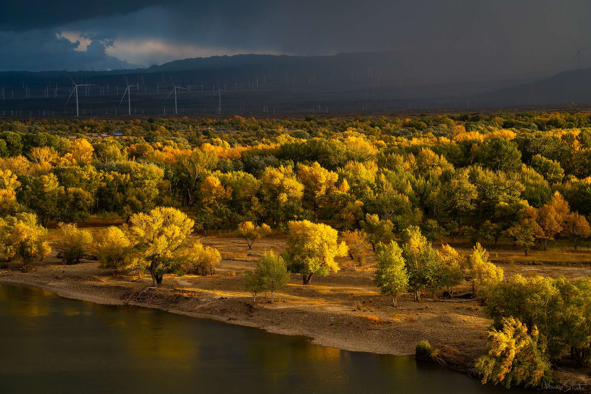 ตอนที่มาถึงนั้น เมฆครึ้มมากครับ แสงไม่มีเลย ภาพที่ได้เลยจะออกมาแบบแบนๆ ไม่ค่อยมีมิติ มองไปไกลๆ เห็นพายุฝนกระหน่ำเป็นสายเลยครับ ผมทำใจแล้วว่า วันนี้คงไม่ได้ภาพแสงสวยๆแน่ๆ แต่ทันใดนั้น ท้องฟ้าได้เปิดออกมาช่วงเดียว ทำให้เกิดแสงเป็นลำ สาดส่องลงมายังแม่น้ำ และต้นไม้ตามแนวป่าเป็นหย่อมๆ ท่ามกลางความมืดขมุกขมัว