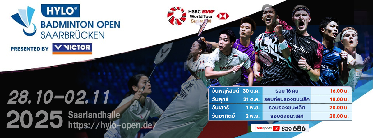 โปรแกรมการแข่งขัน แบดมินตัน HYLO Open 2025 : รอบชิงชนะเลิศ (2 พ.ย. 68) (คู่แรก 20.00 น.)