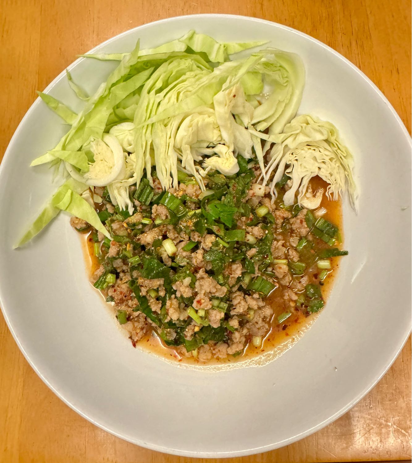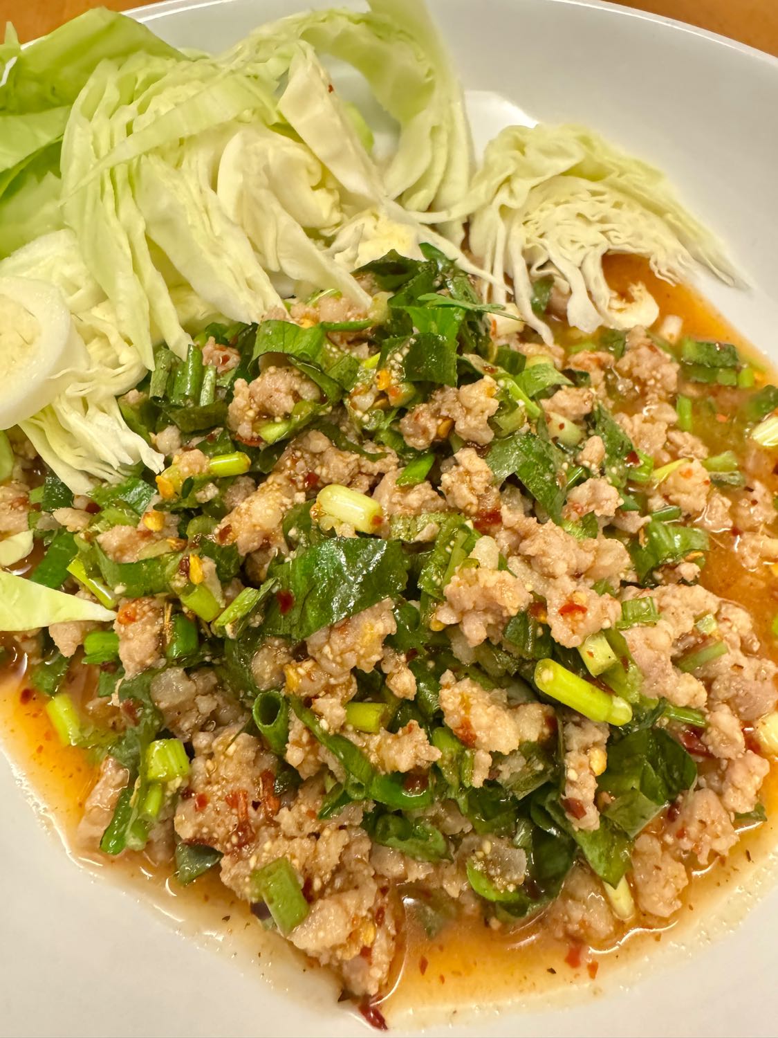 ส่วนหมูคั่วน้ำ ปรุงเครื่องลาบใส่พริกป่น ข้าวคั่ว น้ำปลา น้ำตาล มะนาว ไม่เกิน2นาทีจบ