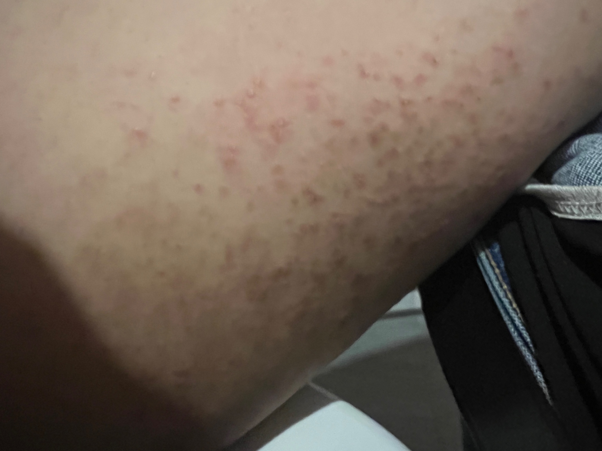 คันตามรูขุมขน ช่วงขาทั้งสองข้าง เกา แล้วเป็นตุ่มใสๆคันมาก เกาจนรามมาที่แขน แต่แขนยังไม่เยอะเท่าไหร่ เกาไปเรื่อยๆ จนมาเป็นตุ่มเหมือนผด ตุ่มแดงๆ ตอนนี้ รามมาตรงก้นแล้ว และลำตัว ช่วงกลางคืนจะคันมาก เหมื