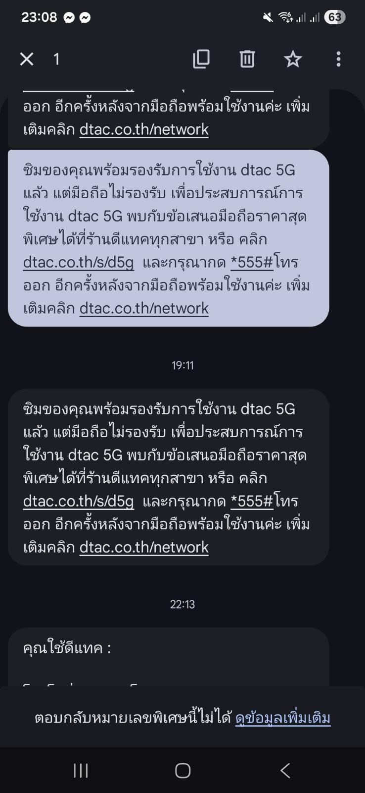 คตามหัวข้อเลยค่ะ คือเรากด *555#แล้วได้ข้อความ “ซิมของคุณพร้อมรองรับการใช้งาน dtac 5G แล้ว แต่มือถือไม่รองรับ เพื่อประสบการณ์การใช้งาน dtac 5G พบกับข้อเสนอมือถือราคาสุดพิเศษได้ที่ร้านดีแทคทุกสาข