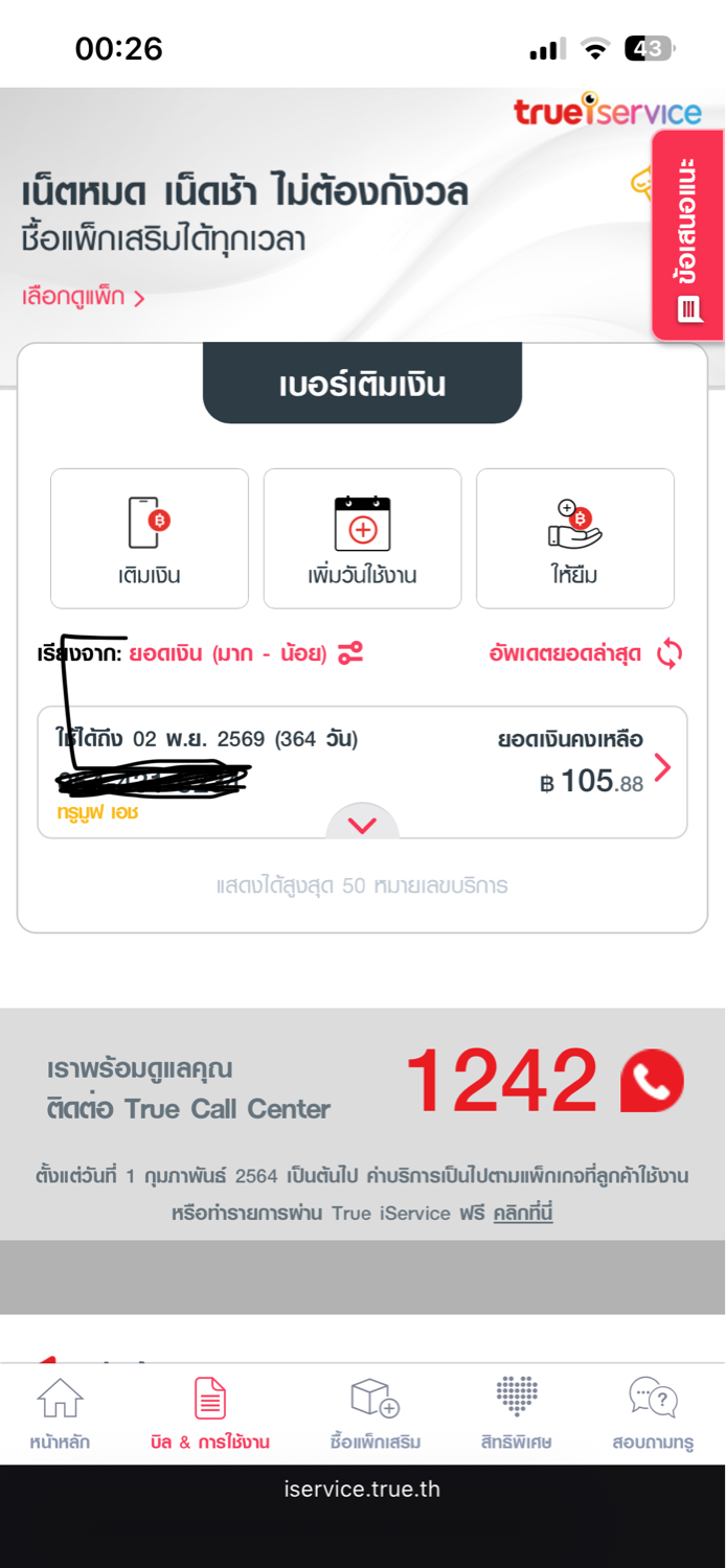 ผมเติมเงิน 110บาทเข้าซิม เพื่อที่จะให้ระบบมันหักค่าเน็ตผม (ค่าเน็ตผม 110บาท/เดือน) พอมาดูใน I service.true เหลือ 105บาท มันหักอะไร นี้ไม่ใช่ครั้งแรกนะครับ  ครั้งก่อนก็โดนมามา เติม 110บาท
