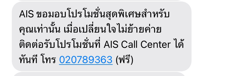 จะย้ายค่ายแล้วaisส่งข้อความ ขอมอบโปรโมชั่นพิเศษให้ แต่โทรไปเบอร์020789363 ไม่ติดซะงั้น รบกวนช่วยโทรกลับมาด้วยค่ะ
