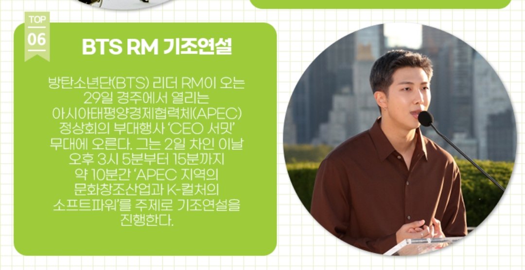 RM หัวหน้าวง BTS ขึ้นเวทีในงาน "CEO Summit" ซึ่งเป็นงานคู่ขนานของการประชุมสุดยอดความร่วมมือทางเศรษฐกิจเอเชีย-แปซิฟิก (APEC) ที่เมืองคยองจู ในวันที่ 29 เขาจะกล่าวสุนทรพจน์สำคัญในหัวข้อ "อุตสาหกรรมวัฒนธรรมและสร้างสรรค์ในภูมิภาค APEC และพลังแห่งวัฒนธรรมเกาหลี" เป็นเวลาประมาณ 10 นาที ตั้งแต่เวลา 15:15 น. ของวันที่สอง
