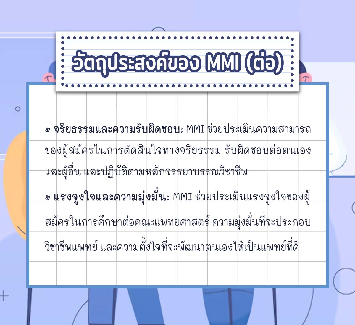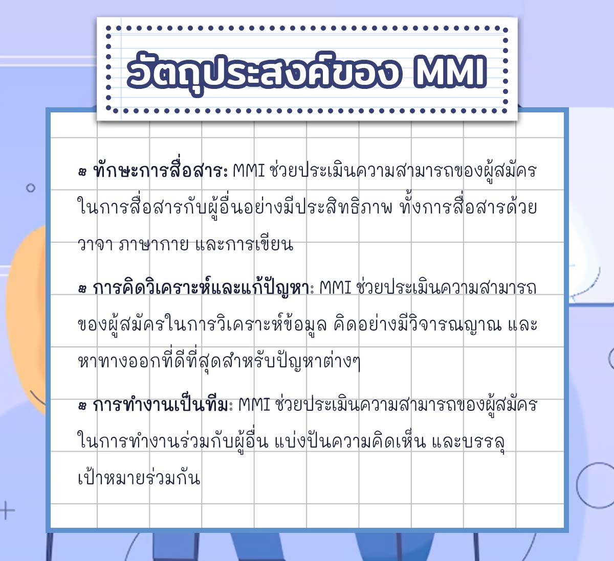 จุดประสงค์ของ MMI คือการประเมิน “ทักษะเชิงพฤติกรรมและความเป็นมืออาชีพ” ไม่ใช่เพียงแค่ความรู้เชิงวิชาการ