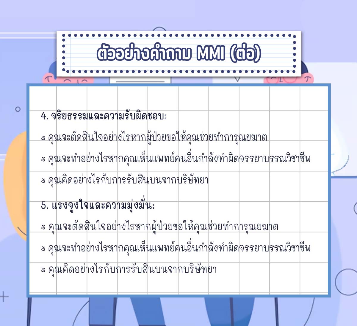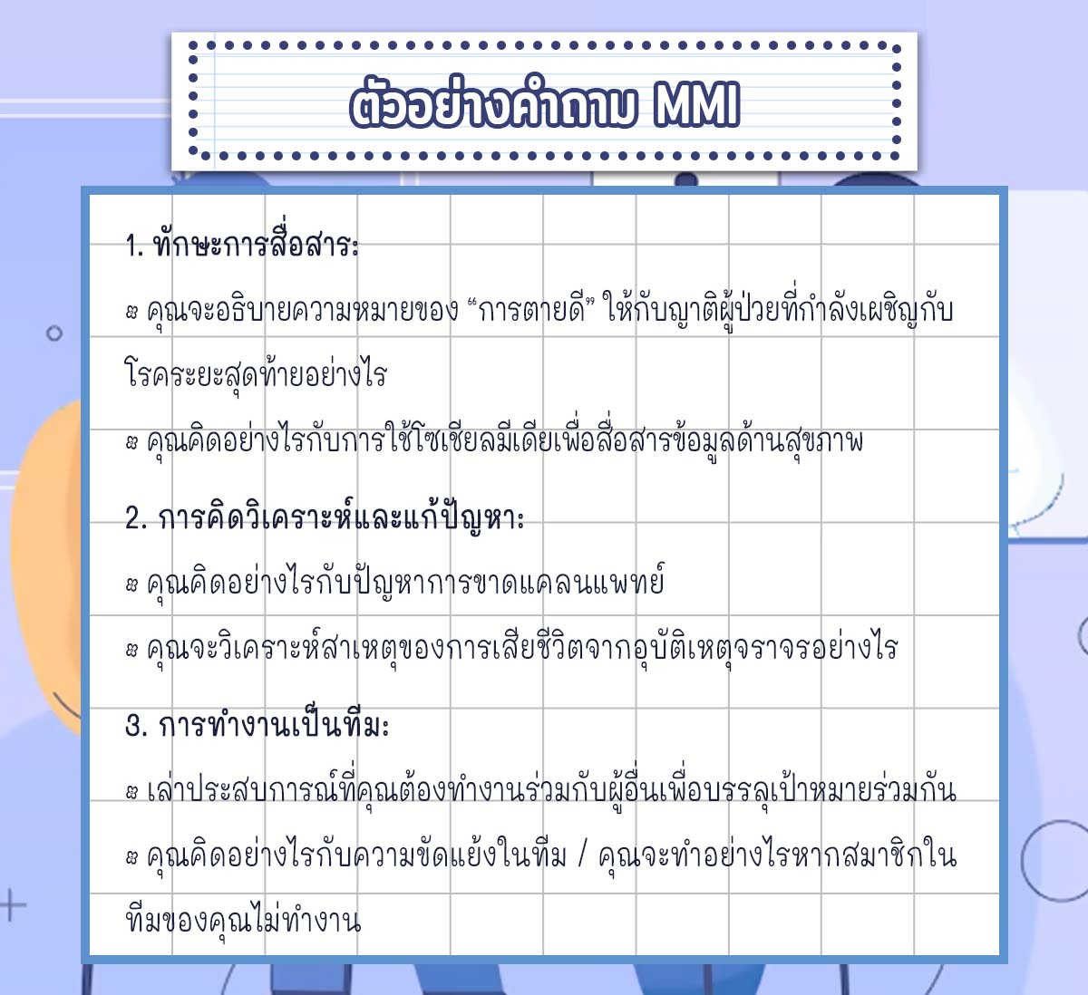 MMI เป็นโอกาสแสดงคุณสมบัติที่เหมาะสมกับวิชาชีพด้านสุขภาพ การเตรียมตัวอย่างเป็นระบบและการสื่อสารที่ดี จะช่วยเพิ่มความมั่นใจและทำให้การสอบราบรื่นมากขึ้น