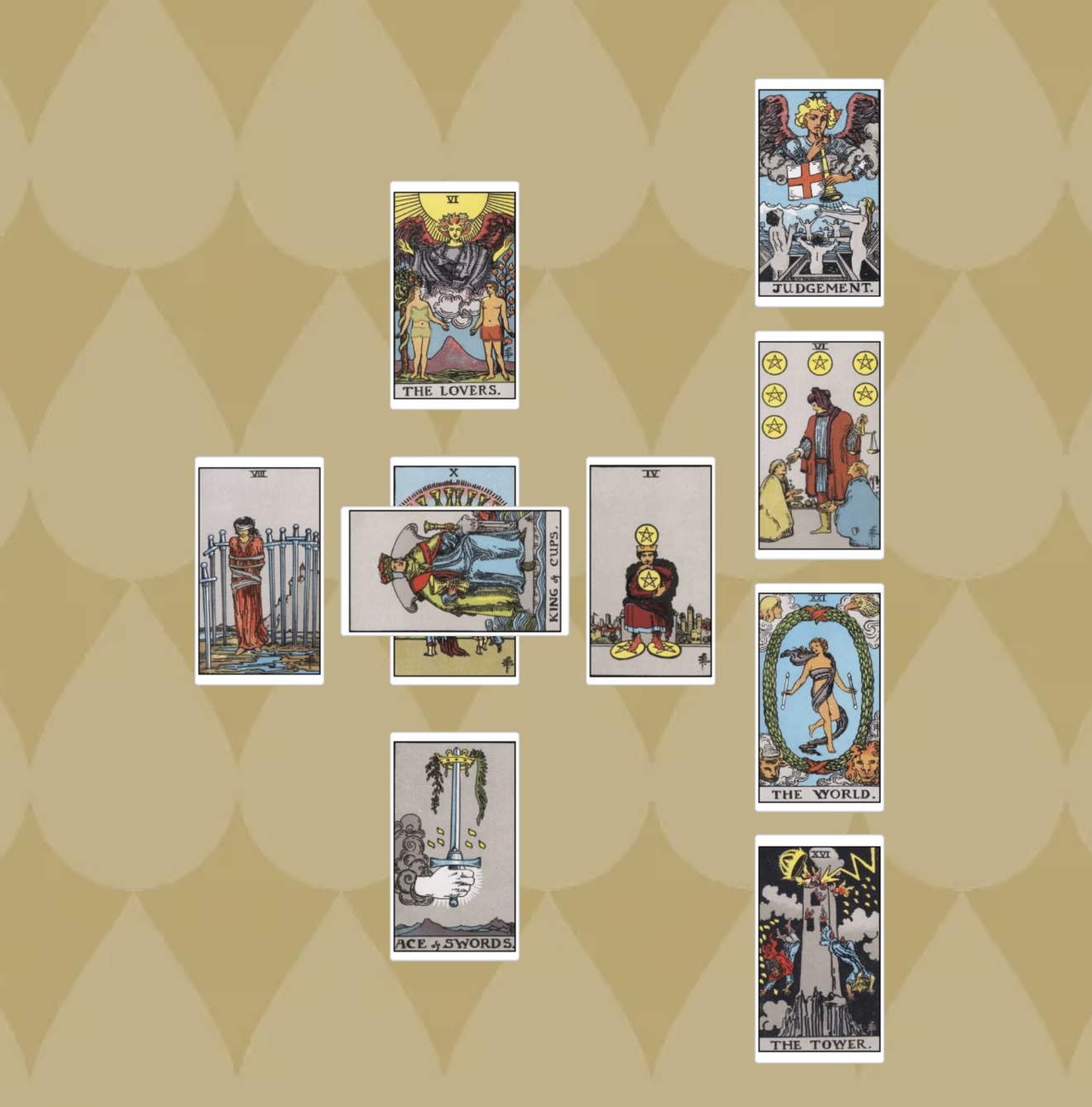 1. The Tower 2. The Chariot 3. THE NINE OF WANDS 4. FIVE OF SWORDS 5. The Fool 6. THE PAGE OF SWORDS 7.THE QUEEN OF WANDS 8.THE QUEEN OF SWORDS 9. The Devil 10. ACE