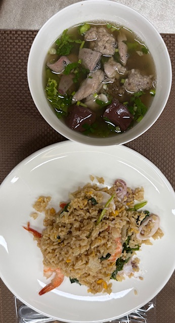 มีขนมจีนแกงเขียวหวานเนื้อและไก่ จัดเขียวหวานเนื้อมา 1 จาน กับผัดหมี่ชมพูอีก 1 จาน ต่อท้ายด้วย ไอศครีมอีก 1 ถ้วย อิ่มแน่นมากจุกๆ