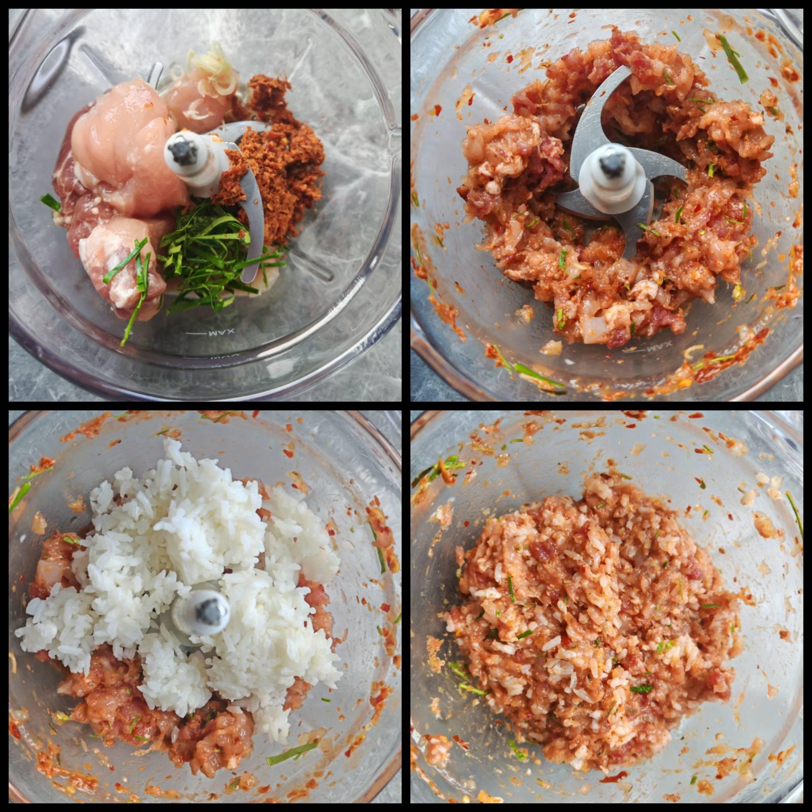 1.ใส่ส่วนผสมทั้งหมด ยกเว้นข้าว ลงเครื่องปั่น ปั่นให้เข้ากันไม่ต้องละเอียดมาก แล้วใส่ข้าวลงไปปั่นต่ออีกแปบ
