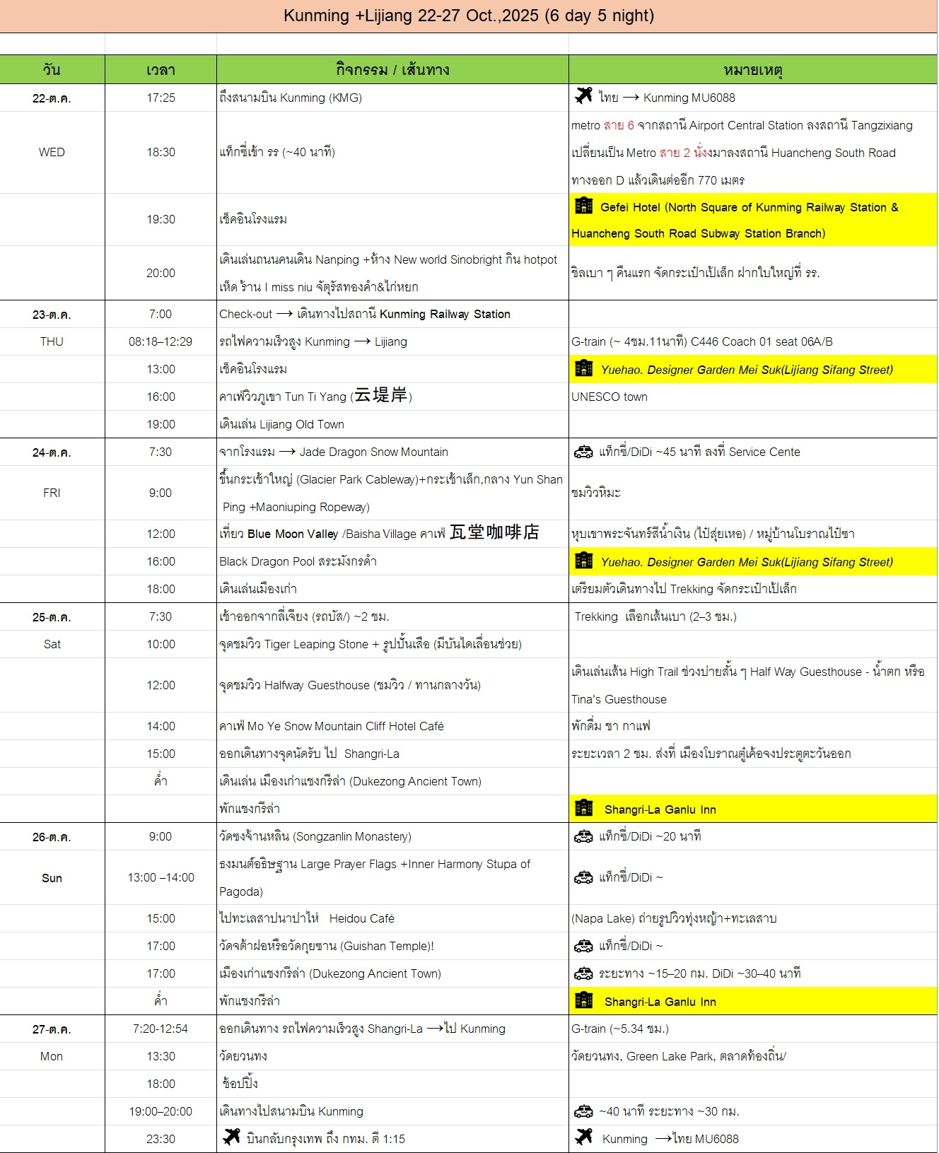 เส้นทาง การเดินทางสำหรับ 6 วัน ค่อยๆไต่ระดับความสูงไปเรื่อยๆ เพราะกลัวว่าร่างกายจะปรับตัวกับระดับความสูงไม่ทัน และเกิดAltitude Sickness หรือโรคแพ้ความสูงได้ โดยก่อนเดินทาง ก็กินยา Diamox ไปล่วงหน้าก่อนขึ้นที่สูง 1 วัน คือ ไปถึงคุนหมิงแล้วกินเม็ดที่ 1 ในตอนเย็นหลังจากนั้นก็กินเช้า - เย็นต่อเนื่องจนถึงวันกลับเลยค่ะ ทำให้ไม่มีอาการแพ้ความสูงเลย (อันตรายมากนะคะถ้าหากเกิดและไม่ได้เตรียมตัวไป) อย่างไรแนะนำปรึกษาแพทย์หรือเภสัชก่อนเดินทางด้วยนะคะ สำหรับการใช้ยา