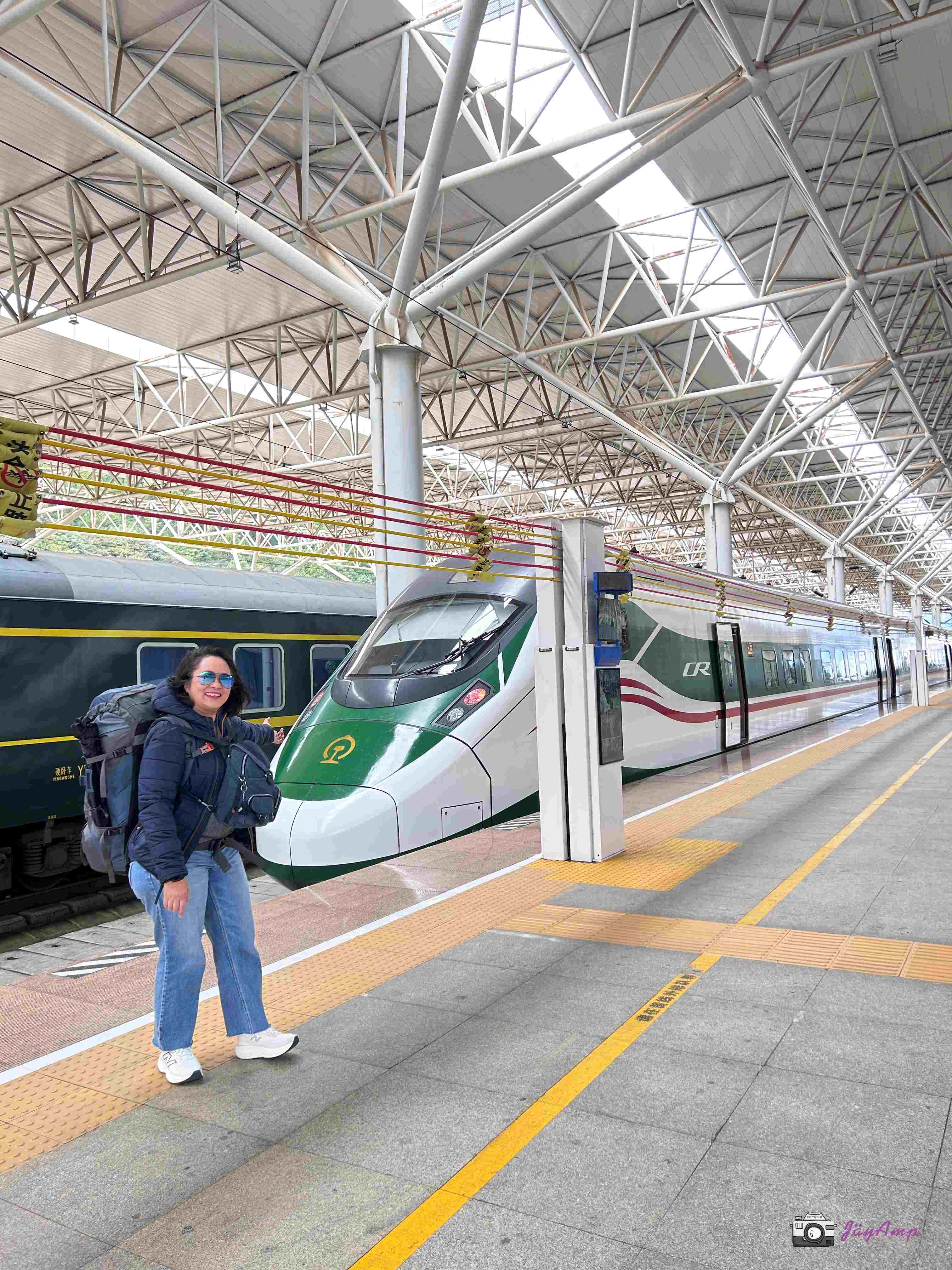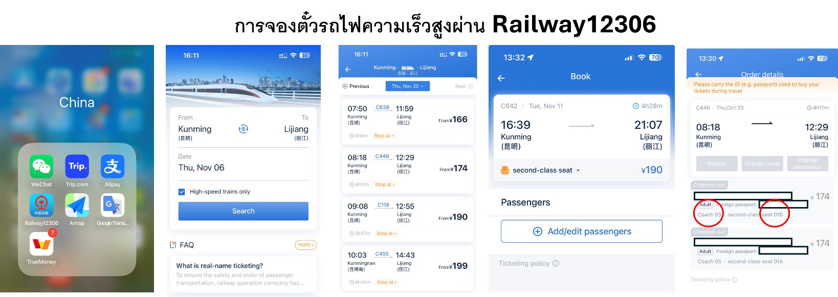ขั้นตอนการจองตั๋วรถไฟความเร็วสูงมีดังนี้ค่ะ การจองผ่าน Appทางการของจีน Raiway12306 จะได้ราคาถูกกว่าจองผ่าน Trip อยู่พอสมควรนะคะ แต่ต้องมีการ add ผู้โดยสารโดยใช้ข้อมูล passport เข้าไปก่อนค่ะ โดยในการเดินทางก็ใช้แค่ passport ใบเดียวแค่นั้นเลย ไม่ต้องมี QR code หรือตั๋วใดๆ สะดวกมากๆ การมาเช็คอิน มาก่อนเวลาซัก 30 นาทีหรือมากกว่า ก็ดีนะคะ บางครั้งเจอกรุ๊ปทัวร์คนเยอะจะได้ไม่เร่งรีบเกินไป ดูรอบเวลา ขบวนรถและเลขที่นั่งได้จากระบบเลยค่ะ เลขขบวนรถจะขึ้นบนจอให้เลย ตัวอย่าง C446 Coach 05 seat 01A/B