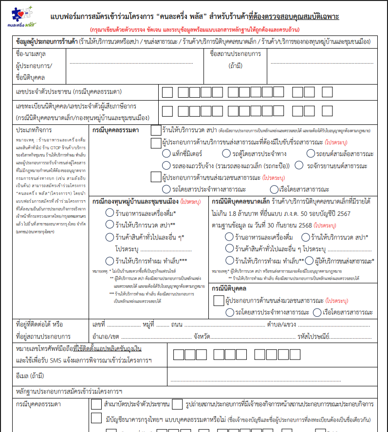 "แบบฟอร์มการสมัครเข/าร่วมโครงการ “คนละครึ่ง พลัส” สำหรับร้านค้าที่ต้องตรวจสอบคุณสมบัติเฉพาะ"