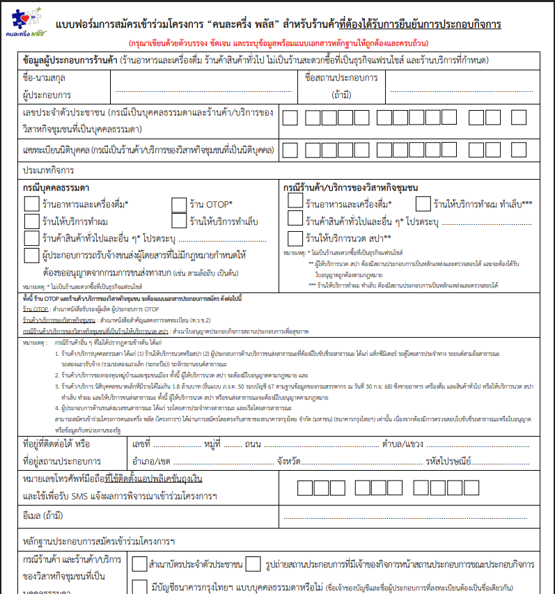 "แบบฟอร์มการสมัครเข/าร่วมโครงการ “คนละครึ่ง พลัส” สำหรับร้านค้าที่ต้องได้รับการยืนยันการประกอบกิจการ"