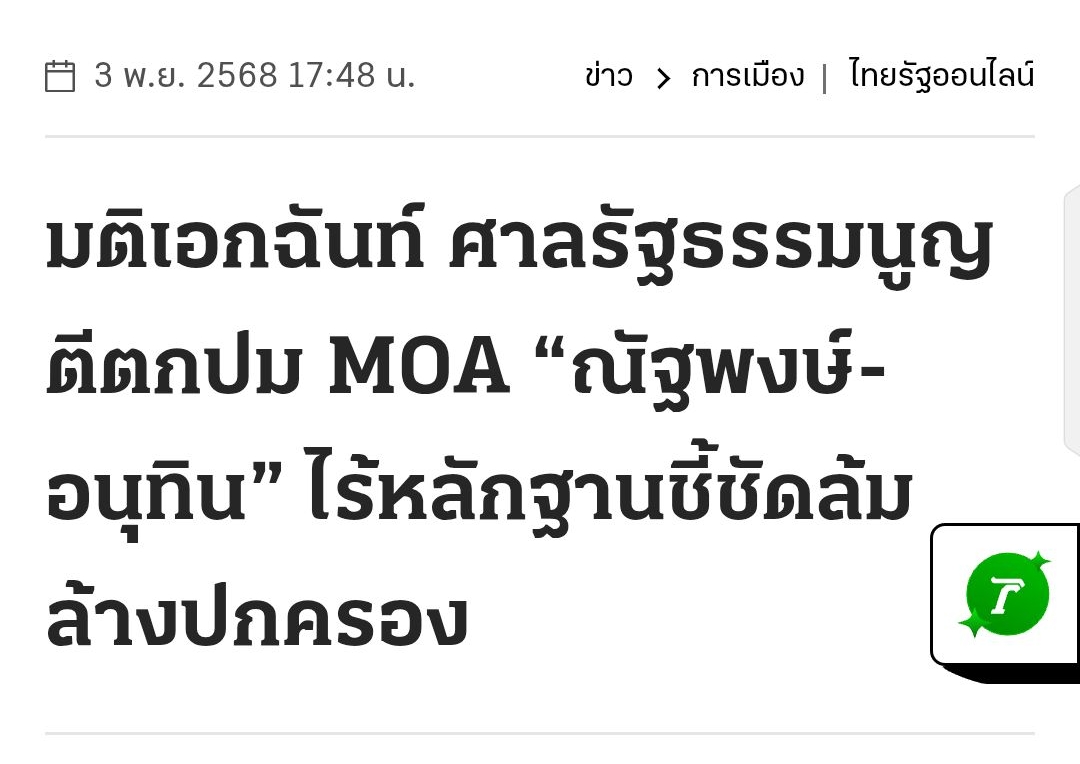 🔎 มติเอกฉันท์ ศาลรัฐธรรมนูญตีตกปม MOA “ณัฐพงษ์-อนุทิน” ไร้หลักฐานชี้ชัดล้มล้างปกครอง
