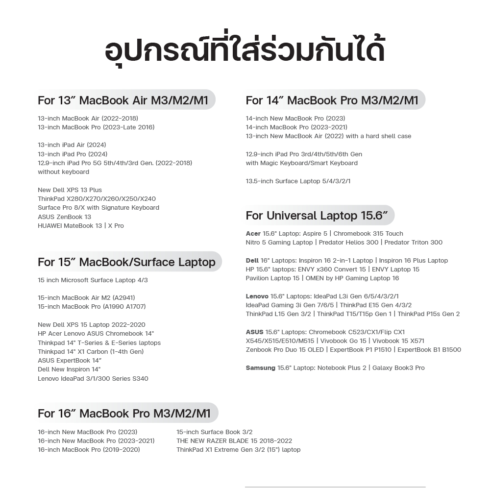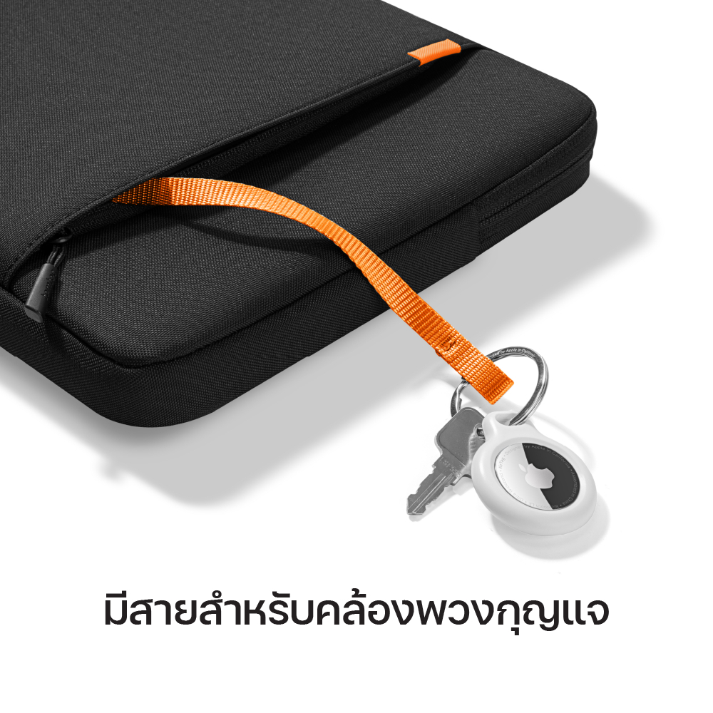ช่องหลักฟิตพอดีไม่โยกไปมา ขณะที่ช่องซิปหน้าช่วยจัดระเบียบอะแดปเตอร์ เมาส์ และสายชาร์จ แถมมีสายคล้อง AirTag งานประกอบเรียบหรูเข้ากับสไตล์มินิมอล ใช้ได้กับแบรนด์อื่น เช่น Dell XPS, ThinkPad, Surface, ASUS ZenBook เหมาะกับการทำงานและการเดินทางประจำวัน 🎒