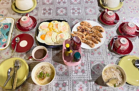 ที่มี ข้าวต้มหมู ไข่ดาว แฮมเบิร์ก ที่จัดเต็มเป็นพิเศษ (เพราะมากันหลายคน)