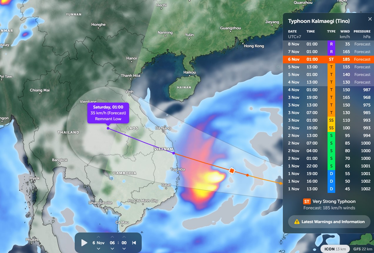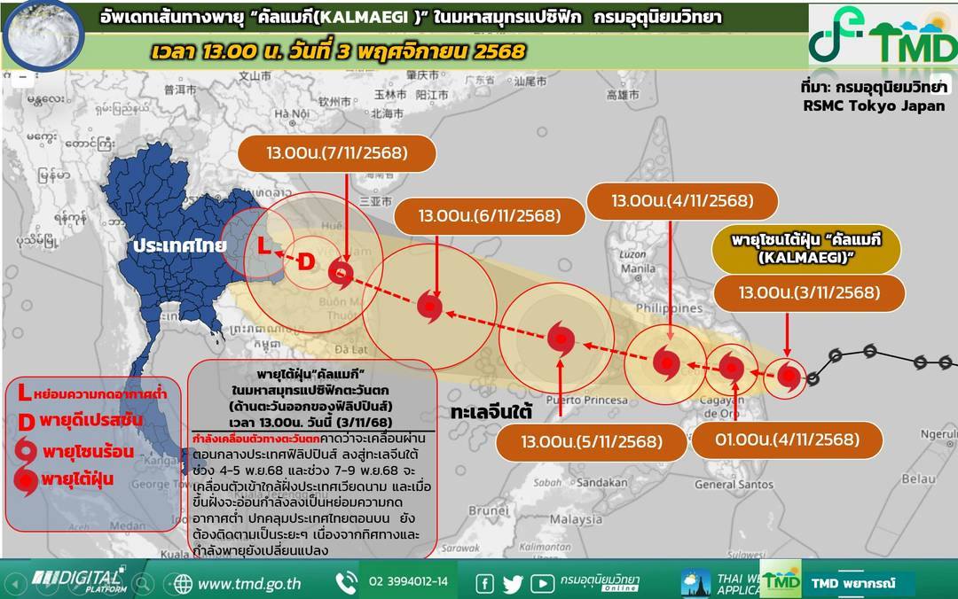 พายุ"คัลแมกี" บ่ายวันที่3พย. ทวีกำลังแรงเป็นพายุไต้ฝุ่นแล้ว กำลังเคลื่อนตัวทางตะวันตก คาดว่าจะเคลื่อนผ่านตอนกลางประเทศฟิลิปปินส์ ลงสู่ทะเลจีนใต้ ช่วง 4-5 พ.ย.68 และช่วง 7-9 พ.ย.68 จะเคลื่อนตัวเข้าใกล้ฝั่งประเทศเวียดนาม และเมื่อขึ้นฝั่งแล้วจะอ่อนกำลังลงเป็นหย่อมความกดอากาศต่ำปกคลุมประเทศไทยตอนบน ยังต้องติดตามเป็นระยะๆ เนื่องจากทิศทางและกำลังพายุยังเปลี่ยนแปลงได้