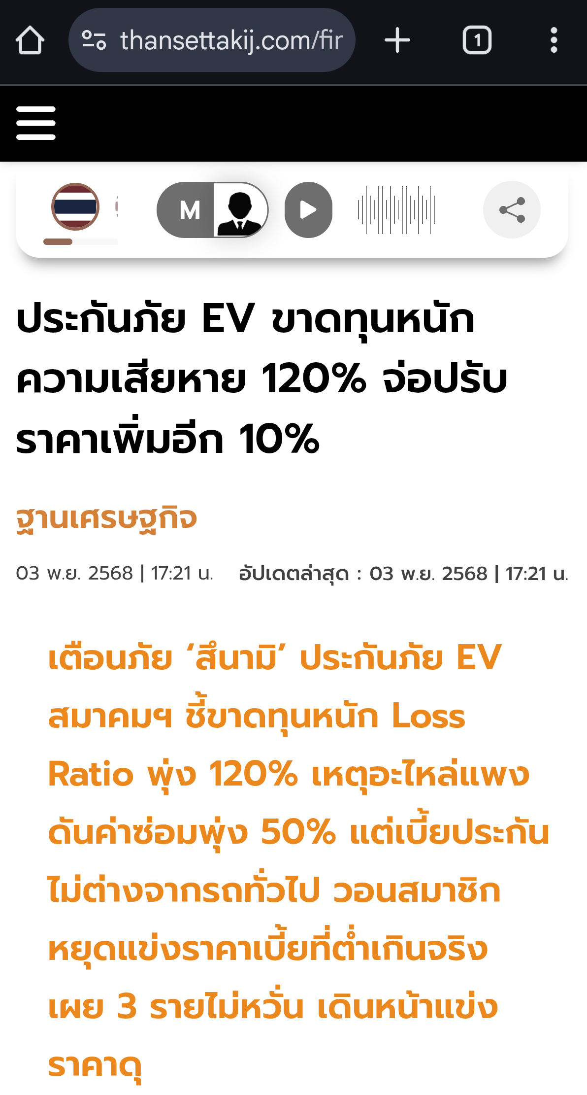 ประกันภัย EV สะเทือน! ขาดทุนหนัก ความเสียหาย 120% จ่อปรับเบี้ยเพิ่ม 10%