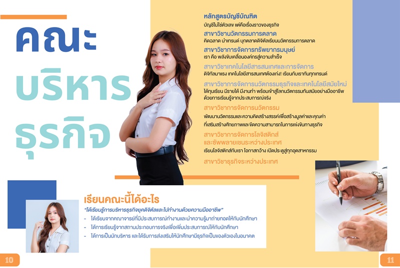 มาเริ่มที่คณะแรก กับคณะยอดนิยมอย่าง คณะบริหารธุรกิจ เพื่อนๆ คนไหนที่อยากเข้าใจการทำธุรกิจจริง การบริหารจัดการด้านธุรกิจ หรือเป็นผู้ประกอบการ คณะนี้ถือว่าโดนใจแน่นอน ในส่วนของสาขาวิชาก็มีให้เลือกทั้ง หลักสูตรบัญชีบัณฑิต , สาขาวิชานวัตกรรมการตลาด , สาขาวิชาการจัดการทรัพยากรมนุษย์ , สาขาวิชาเทคโนโลยีสารสนเทศและการจัดการ , สาขาวิชาการจัดการนวัตกรรมธุรกิจและเทคโนโลยีสมัยใหม่ , สาขาวิชาการจัดการนวัตกรรม , สาขาวิชาการจัดการโลจิสติกส์และซัพพลายเชนระหว่างประเทศ , สาขาวิชาธุรกิจระหว่างประเทศ
