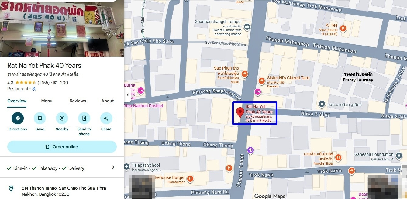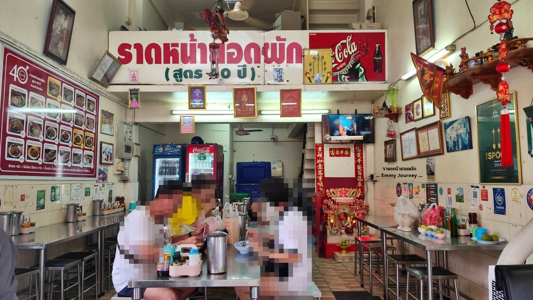 มีโอกาสได้ทานราดหน้ายอดผักร้านนี้บ่อยอยู่ ชื่อร้านราดหน้ายอดผัก (สูตร 40 ปี) อยู่ที่ถนนตะนาว ศาลเจ้าพ่อเสือ เขตพระนคร กรุงเทพมหานคร ร้านเป็นตึกแถวติดริมถนน อยู่ไม่ไกลจากศาลเจ้าพ่อเสือ ไม่มีที่จอดรถยนต์ ไม่มีห้องแอร์ให้บริการ เปิดทุกวันตั้งแต่เวลา 9.00-21.00 น.