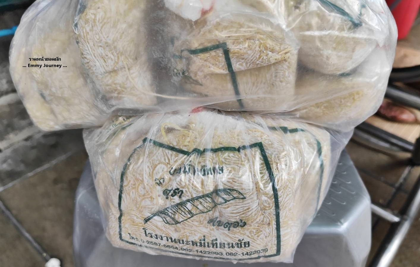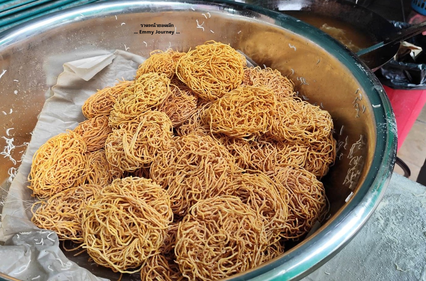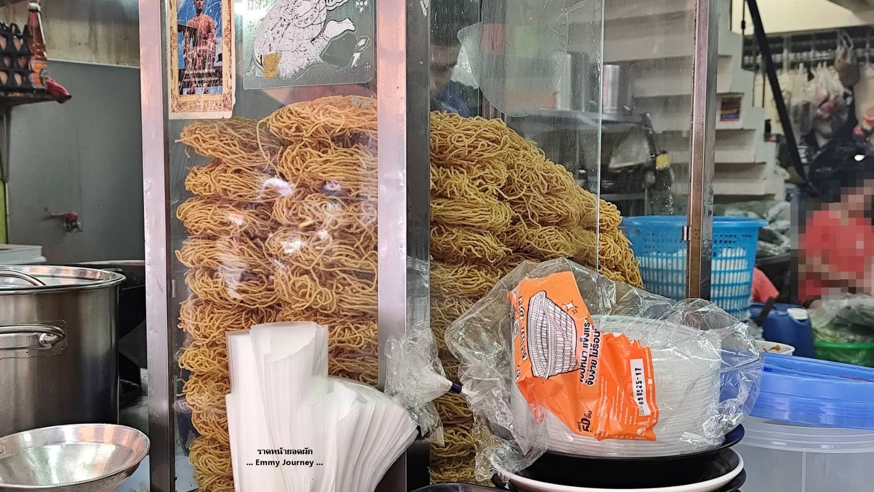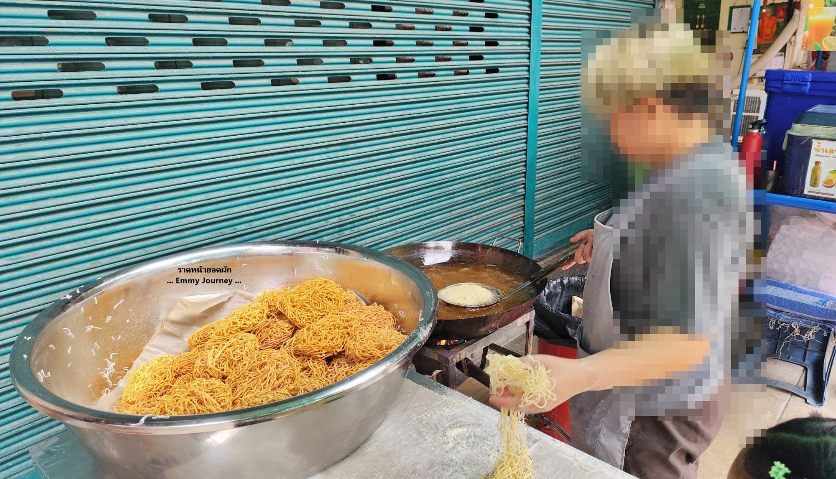 ทางร้านใช้เส้นบะหมี่ตราใบตอง จากโรงงานบะหมี่เทียนชัย มาทอดเป็นเส้นหมี่กรอบ
