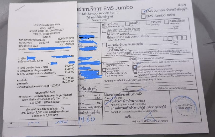 5.1) เมื่อรับของไปที่ปณ สาขาฝั่งบ้านต้นทาง ทางเราเดินทางไป ปณ เพื่อกรอกเอกสาร/ชำระเงินและรับใบเสร็จเอกสารนำส่ง (Hard copy)หรือ