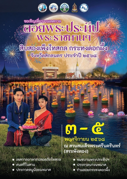 🪷 งานเทศกาลลอยพระประทีป พระราชทานฯสืบสานประเพณีลอยกระทง “สิบสองเพ็งไทสกล กระทงดอกผึ้ง”จังหวัดสกลนคร ประจำปี 2568