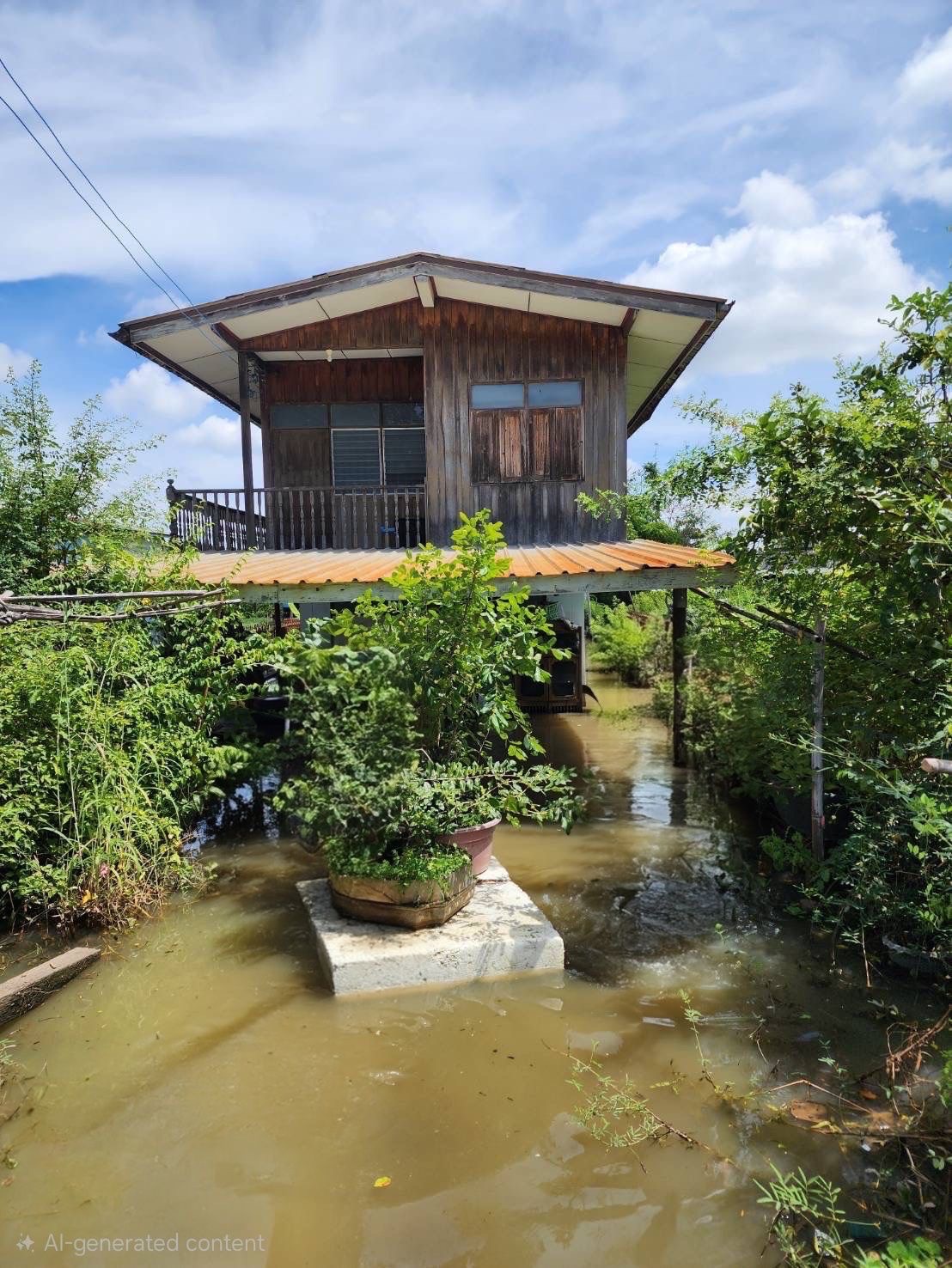 บ้านหลังนี้อายุน่าจะ 40 ปี++ ค่ะ อยู่ในจังหวัดปทุมธานี บ้านไม่มีใครอยู่มานานแล้ว ถนนหน้าบ้านสูงกว่าตัวบ้านขึ้นเรื่อยๆ เพราะอยู่ฝั่งแม่น้ำที่น้ำท่วมถึง