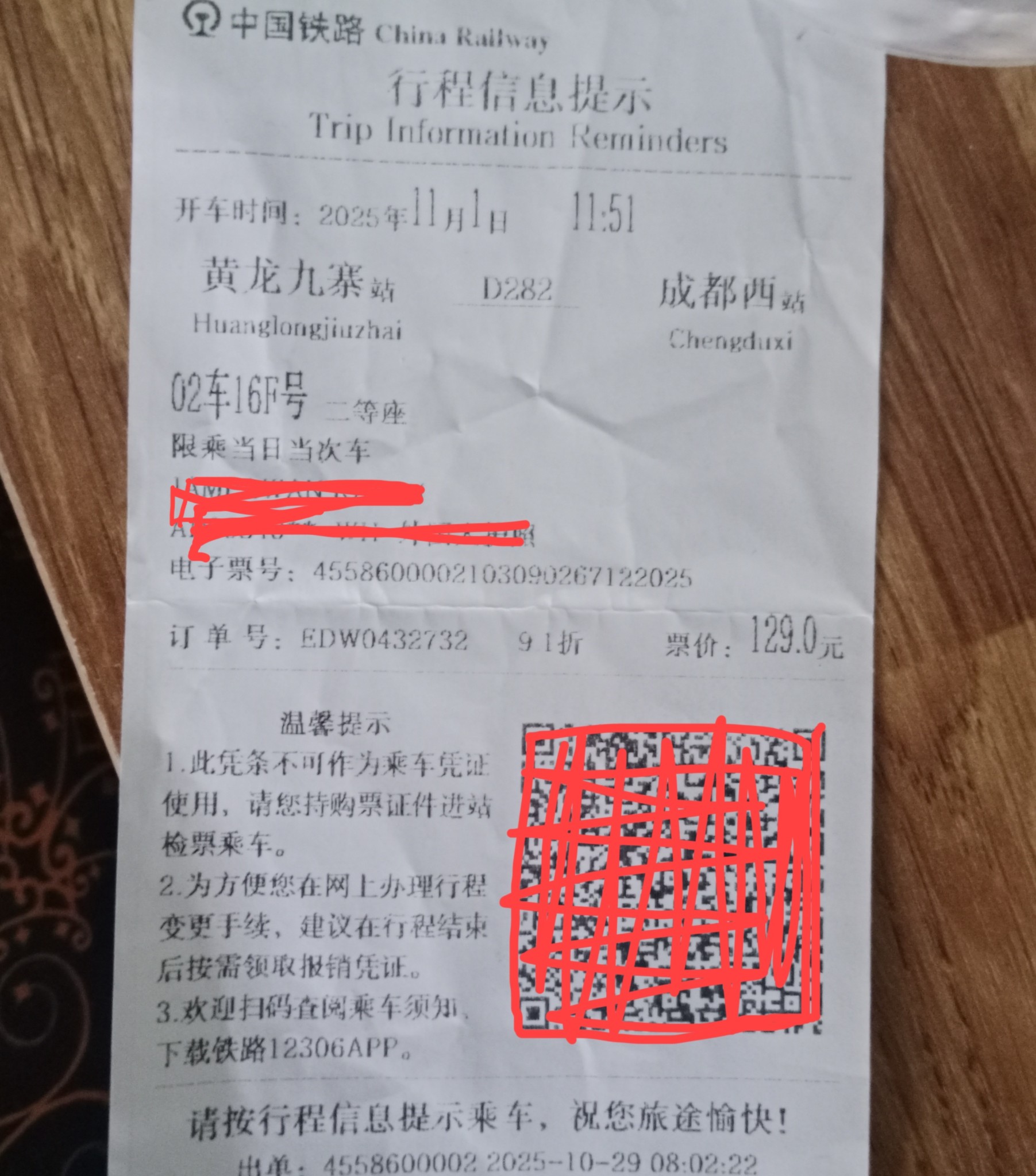 Day 4:29/10/68 วันนี้(จำใจ)ตื่นตี4กว่าเพื่อนั่งแท็กซี่ไปสถานทีรถไฟเฉิงตูดง เช็คเอาท์แบบวางคีย์การ์ดที่กล่องหน้าเคาน์เตอร์เองก็มารอแท็กซี่ เขาก็มารับตรงเวลาตี5ตามที่นัด เอาหน้าจอที่แคปไว้ว่าเป็นเราจริงที่จองไว้ นั่งแปปเดียวก็ถึง(แหงล่ะ ไปแต่เช้ามืดรถจะติดได้ไง)แท็กซี่ที่มารับเป็นมิเตอร์ จ่ายแค่26Y จากรร.ไปสถานีไม่ไกลมาก แค่7สถานีถ้านั่งmetroแต่metroเปิด6โมงเลยต้องเหมาแท็กซี่ รถไฟที่นั่งเป็นขบวนแรกของวันในเส้นจิ่วจ้ายโกว ออกจากเฉิงตูไปซงพาน6.01น.ถึงซงพาน7.34น. วิ่งยาว1.34ชม.โดยไม่จอดที่ไหน ระหว่างอยู่บนรถเราสังเกตว่าที่นั่งไม่เต็มแต่ทำไมตอนจองจากเมืองไทยขึ้นว่าตั๋วเต็มทุกเที่ยว ตั๋วกลับก็ยังไม่มี ขากลับก็เปิดให้จองล่วงหน้าแค่5วัน เราจะกลับวันที่1/11แถมนี่ก็วันที่29/10แล้ว พอรถไฟจอดก็เข้าไปถามหาตั๋วกลับเฉิงตูกับจนท. โชคดีครับ ตั๋วมีขายตั้งแต่รอบเช้าถึง11.51น. รอบหลังเที่ยงขึ้นแดงคือเต็ม ผมก็เลยเลือกรอบ11.51น. จนท.ก็บอกเหมือนจะคอนเฟิร์มว่ารถไฟออกจากส.หวงหลงจิ่วจ้าย ไม่ใช่ซงพานแล้วถึงส.เฉิงตูซี(ต.ตก)ไม่ใช่ดง(ต.ออก)เหมือนขามานะ ยูokนะ ผมโคตรจะokเพราะอยากจะไปกลับจากส.หวงหลงจิ่วจ้ายอยู่แล้ว ไม่ได้อยากมาซงพาน ถึงเฉิงตูสถานีอะไรก็ช่าง สรุปจ่ายเป็นเงินสดคนละ129Y ได้เป็นตั๋วกระดาษแต่ไม่ใช่กระดาษแข็งสีฟ้าเหมือนก่อน ตั๋วนี้น่าจะออกกรณีที่ไม่มีwechatหรือalipay สำหรับใครที่มาจิ่วจ้ายโกวแล้วซื้อตั๋วไม่ทันลองวิธีดูนะครับ ดีใจมากที่ไม่ต้องนั่งรถจนตรูดเปื่อยถึงเฉิงตูแล้ว อ้อ...พอรถไฟจอดหิมะก็เริ่มตกพอดี ด้วยความตื่นเต้นไม่เคยเห็นหิมะตกต่อหน้าเลยขอซักช็อต