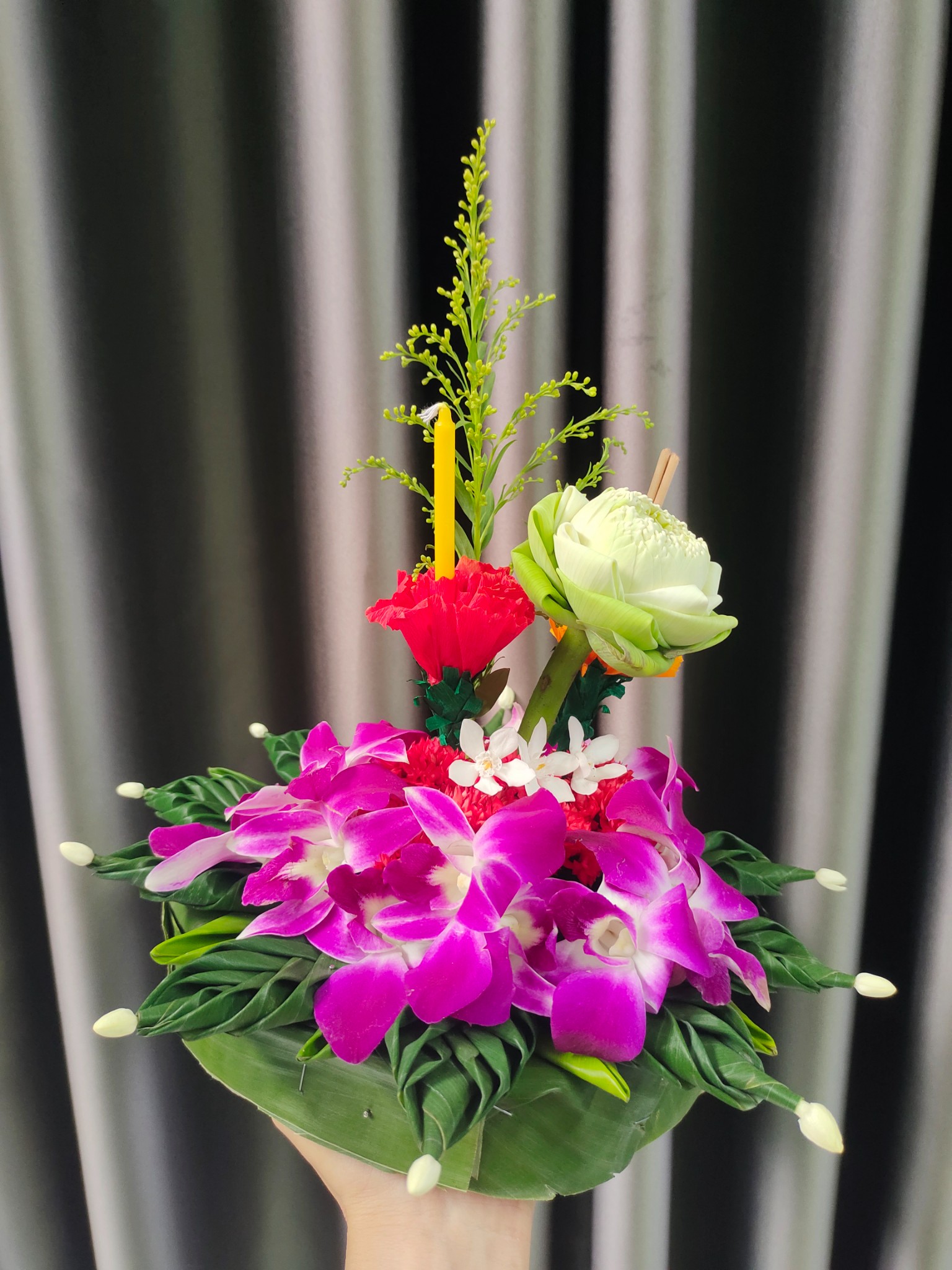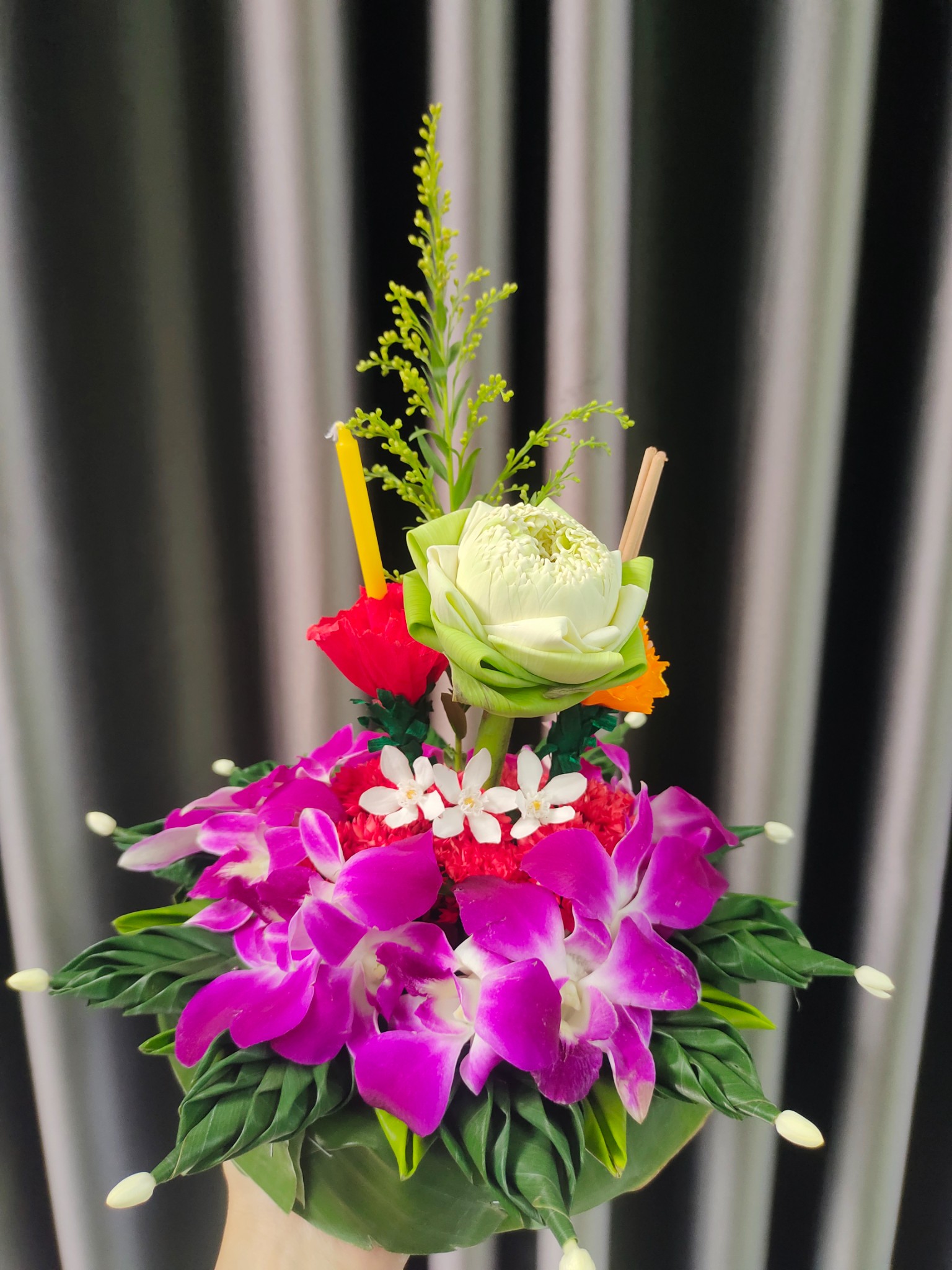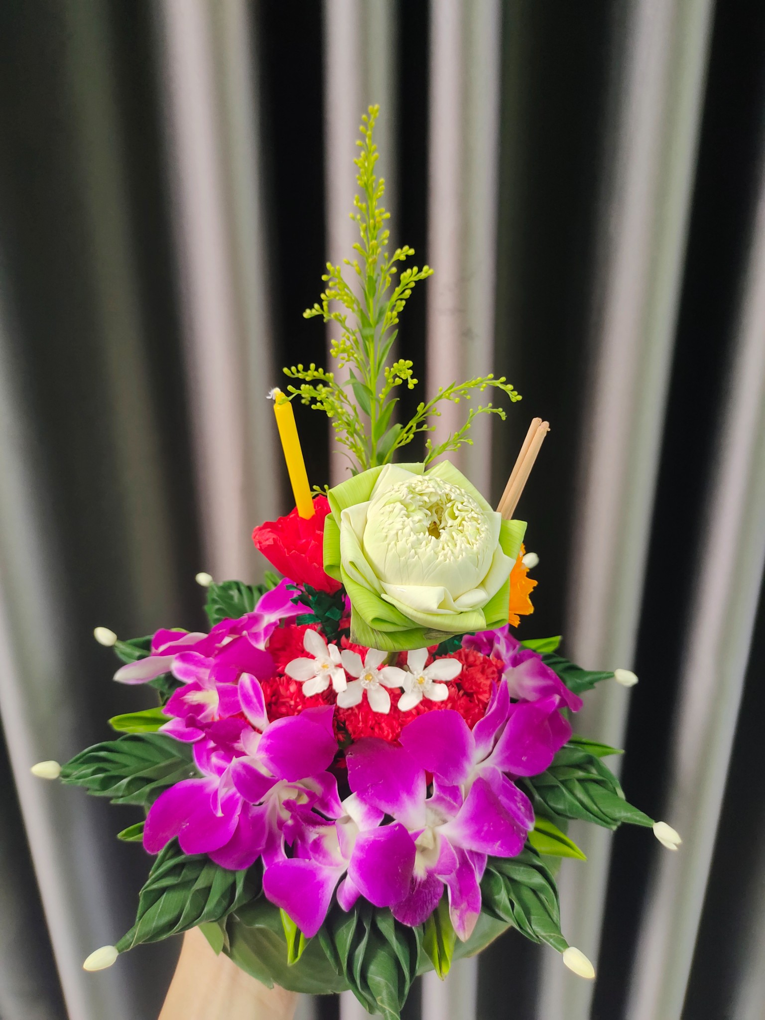 5. ปักธูปเทียนและดอกบัวตรงกลาง จากนั้นตกแต่งด้วยดอกเข็ม ดอกกล้วยไม้และดอกพุดตามตามรูปได้เลนคะ