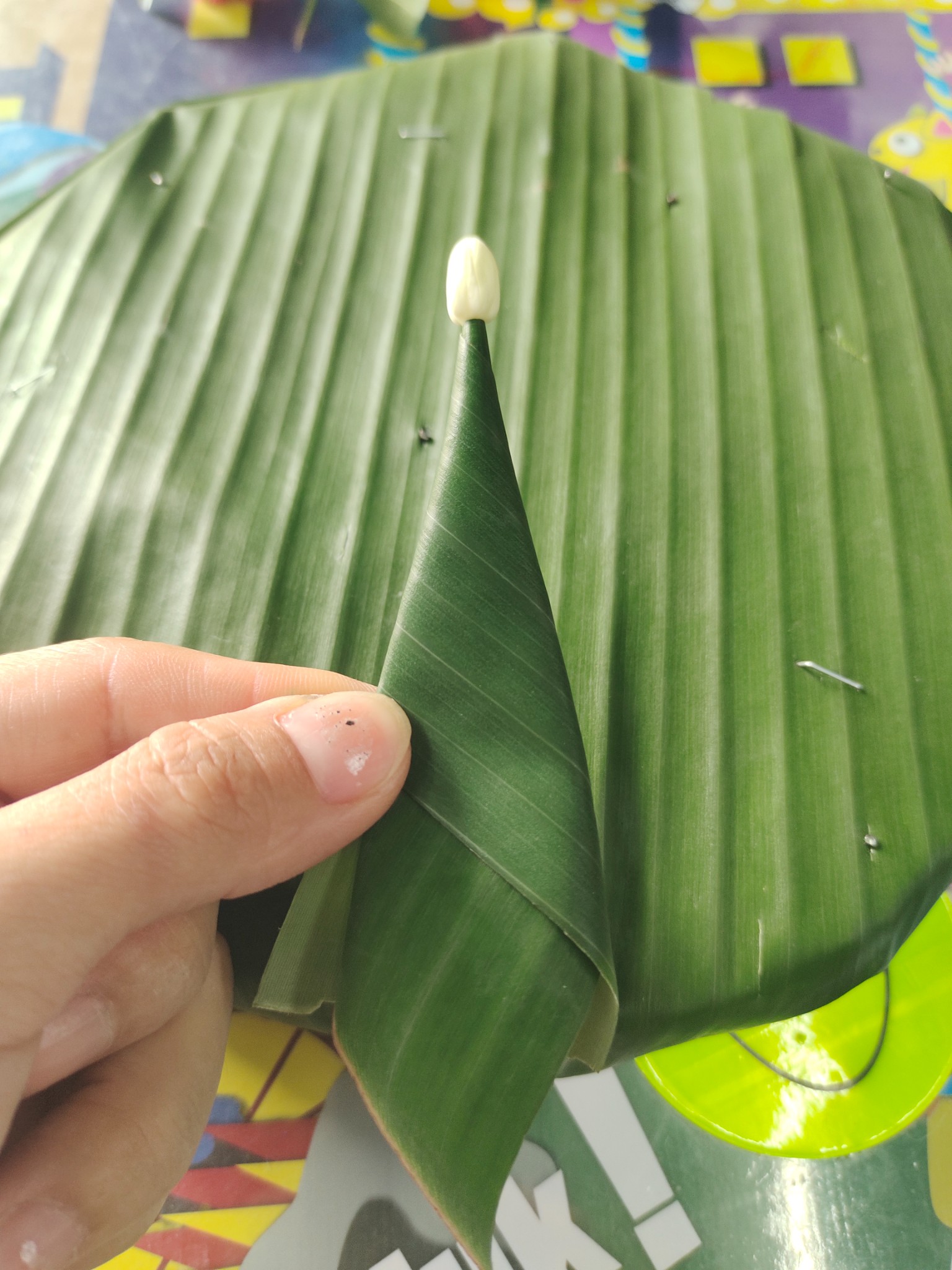 อันดับแรกเลยก็ตากใบตองก่อนคะ ตากแดดประมาณ 10-15 นาทีพอนะคะ แล้วจึงนำมาเช็ดให้สะอาดคะ