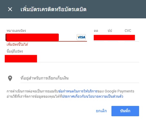 เพิ่มวิธีชำระเงินลงในบัญชี google ไม่ได้ ขึ้น เพิ่มบัตรนนี้ไม่ได้