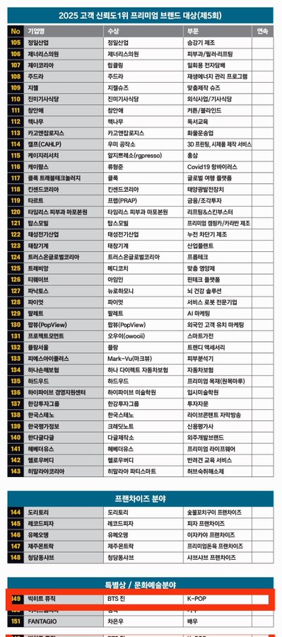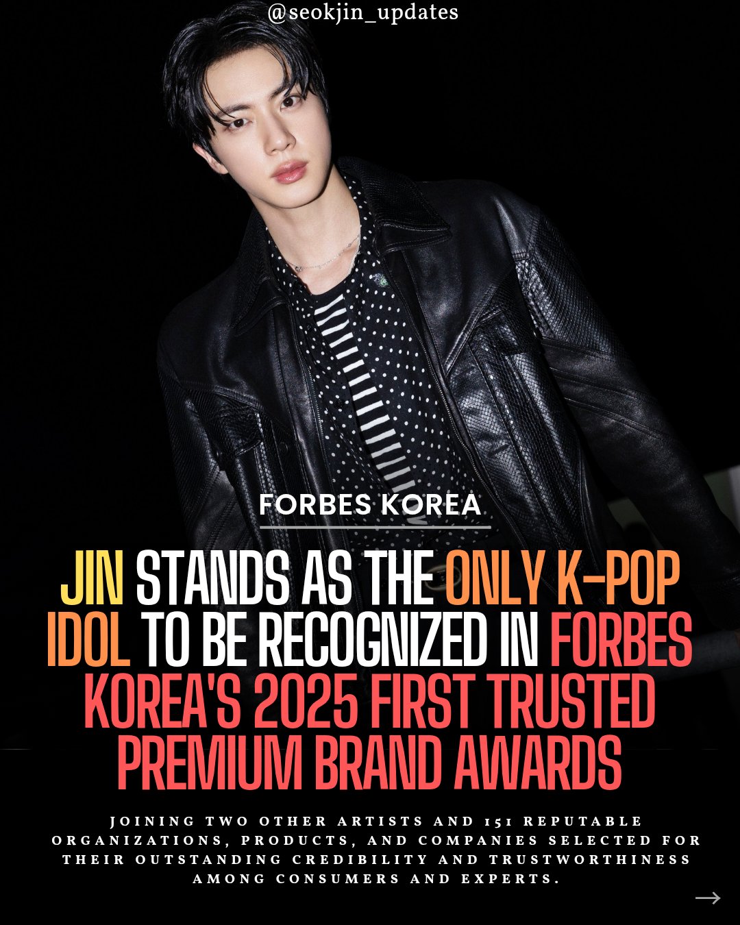 จิน เป็นไอดอล K-pop เพียงคนเดียวที่ได้รับการยอมรับในงาน "2025 First Trusted Premium Brand Awards" ของ Forbes Korea โดยร่วมกับศิลปินอีกสองคน และองค์กร ผลิตภัณฑ์ รวมถึงบริษัทที่มีชื่อเสียงรวม 151 แห่ง ที่ได้รับการคัดเลือกสำหรับความน่าเชื่อถือและความไว้วางใจที่โดดเด่นในหมู่ผู้บริโภคและผู้เชี่ยวชาญ
