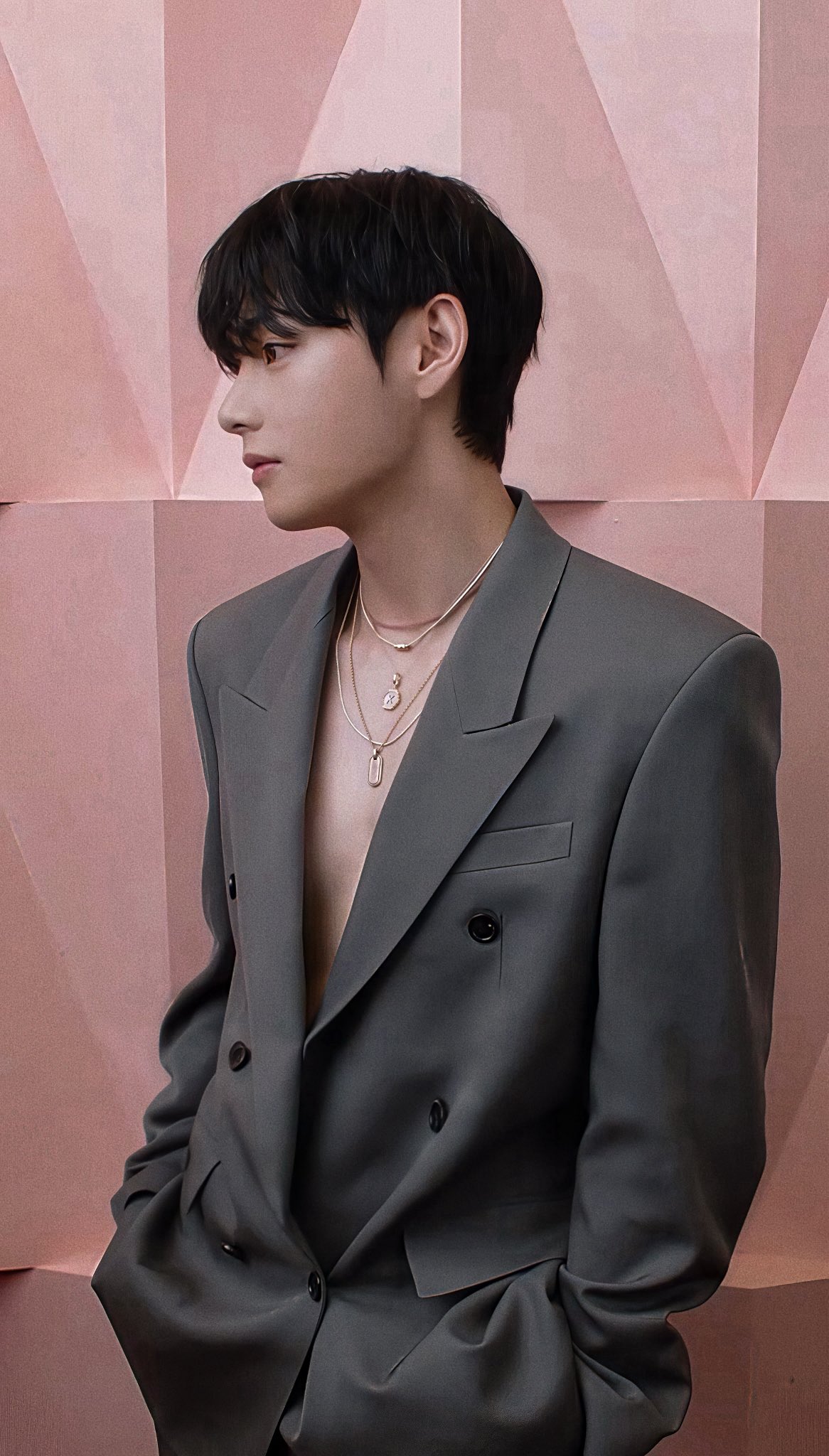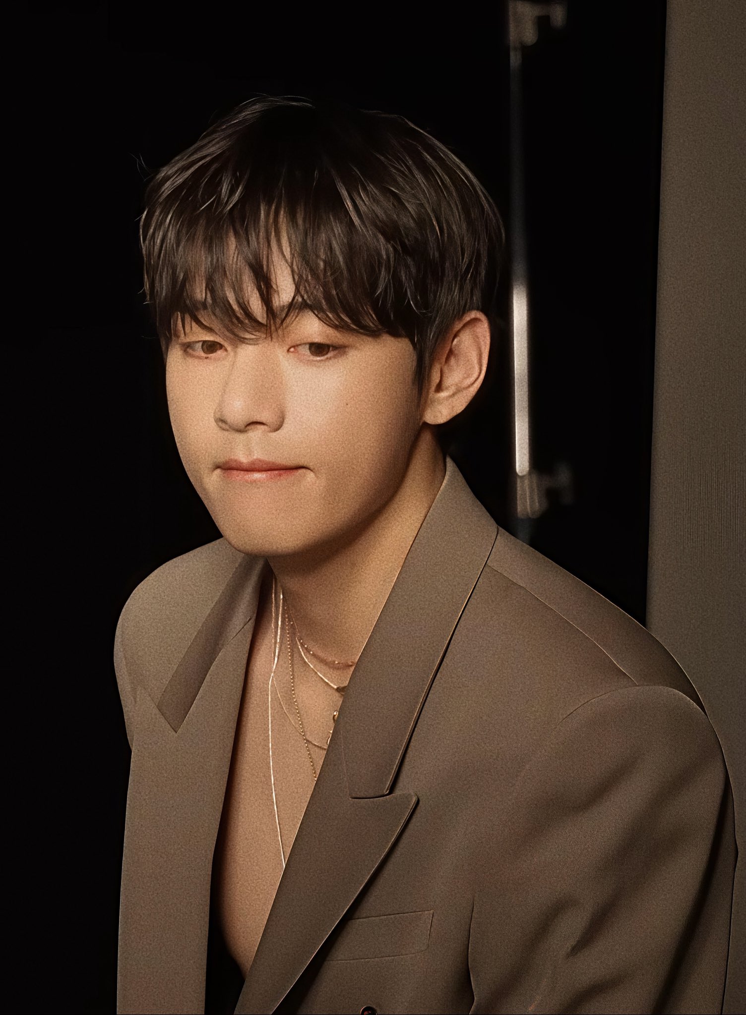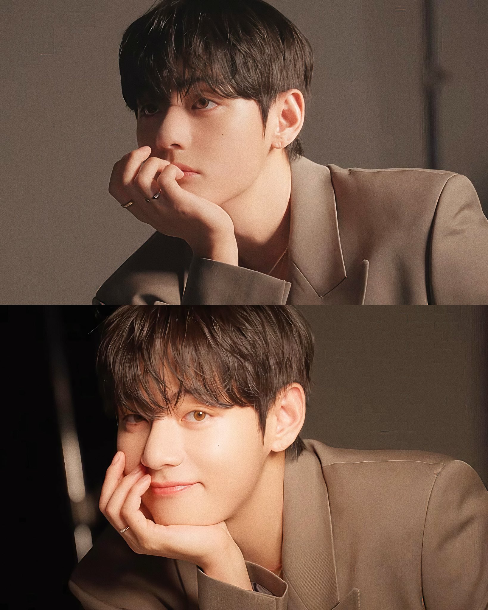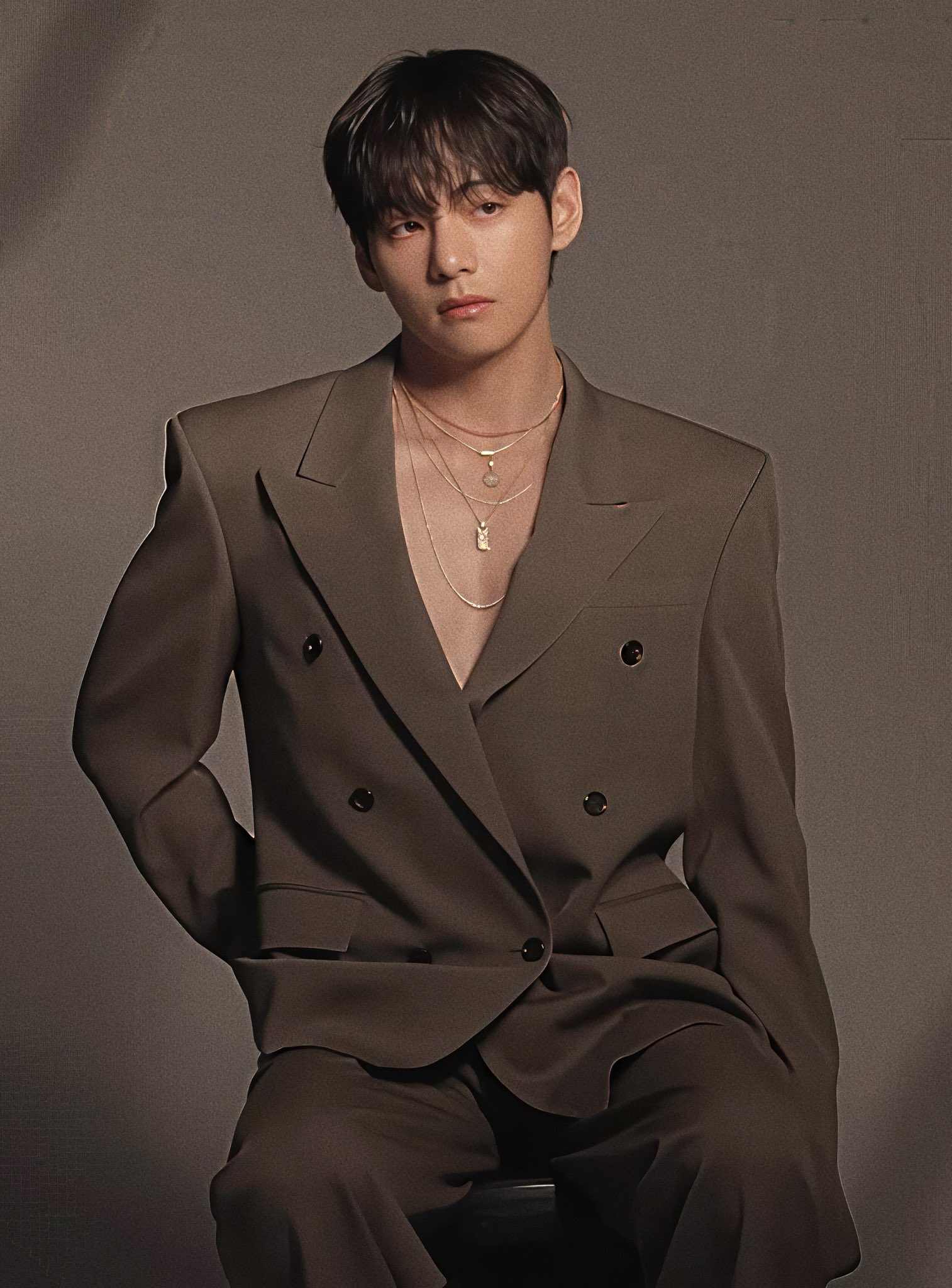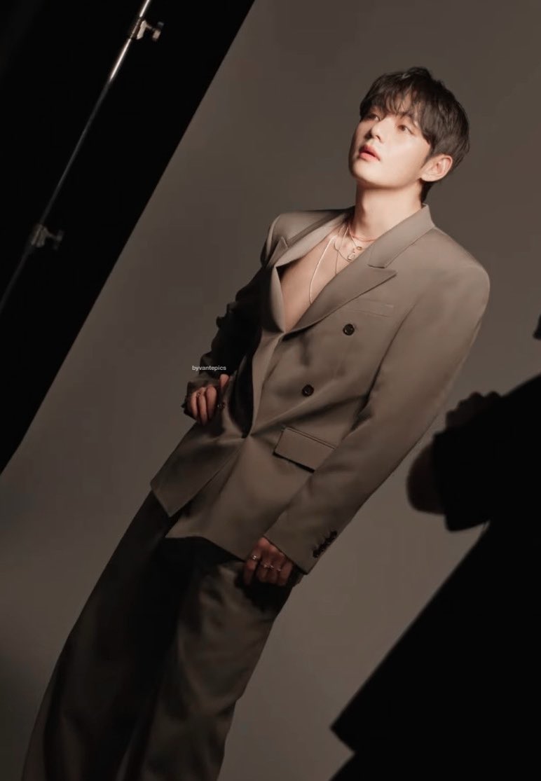 ในการถ่ายทำครั้งนี้ วีปรากฏตัวในชุดสูทเบลเซอร์สีเทาเบจ (Greige) สไตล์ดับเบิ้ลเบรสต์ที่ดูทั้งสุขุมและทันสมัย พร้อมใส่เครื่องประดับสีทองที่เปล่งประกาย ชุดที่เลือกมานี้ยิ่งเสริมให้บรรยากาศที่ดูเรียบหรูและเสน่ห์อันน่าค้นหาของวีโดดเด่นยิ่งขึ้น จนทำให้ทั้งสตูดิโออบอวลไปด้วยความสง่างาม