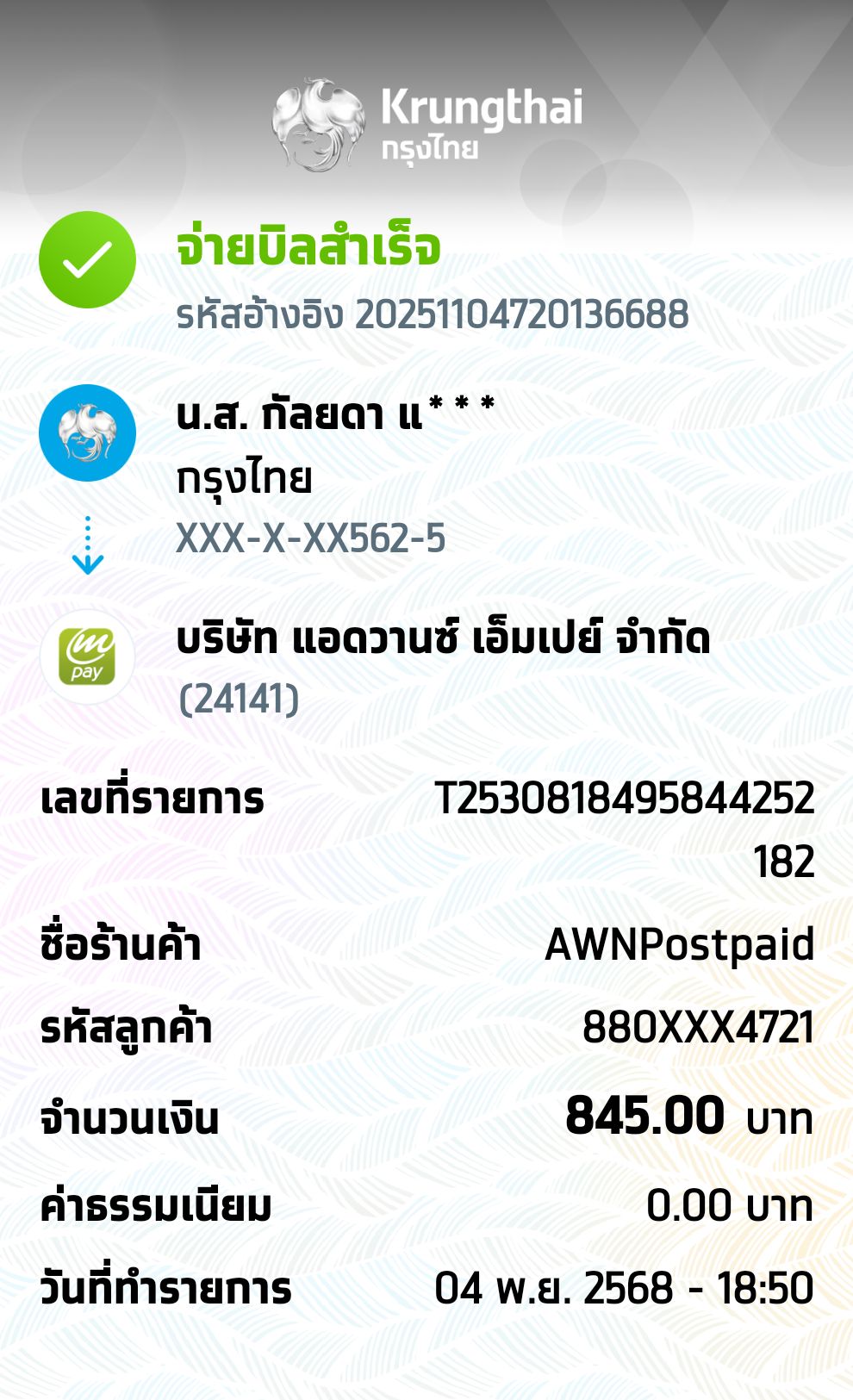 ขอสอบถามนะคะคือเราใช้บริการaisได้3ปีแล้วเราพึ่งสังเกตุเห็นว่ามีใบอันนี้มาด้วยเพราะปกติเราจ่ายผ่านเเอปตลอดจะไม่มีไปรษณีย์มาส่งขอวอบถามทางเจ้าหน้าที่นะคะถ้าเราใช้ถึงวันที่27/5/69แล้วจากที่เคยจ่าย399ต่อเ