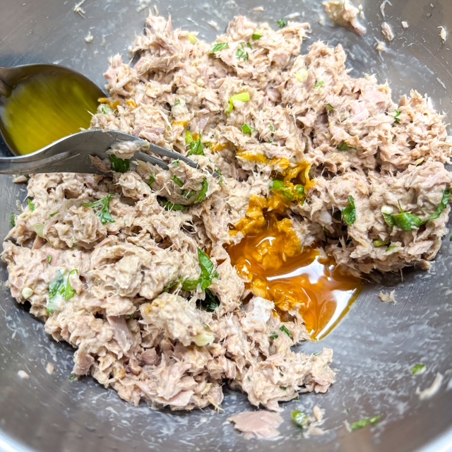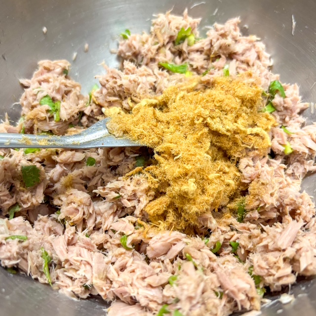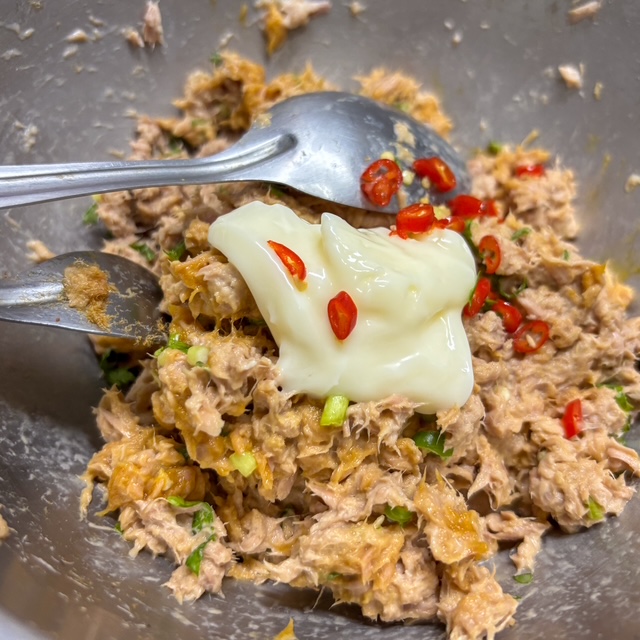 บางคนอาจจะคิดว่า มันไม่เข้ากัน แต่ซอสส้มเข้มข้น(ซันควิก) เพิ่มเติมลงเล็กน้อย จะทำให้รสชาติดี และไม่คาวทูน่ามากเกินไป