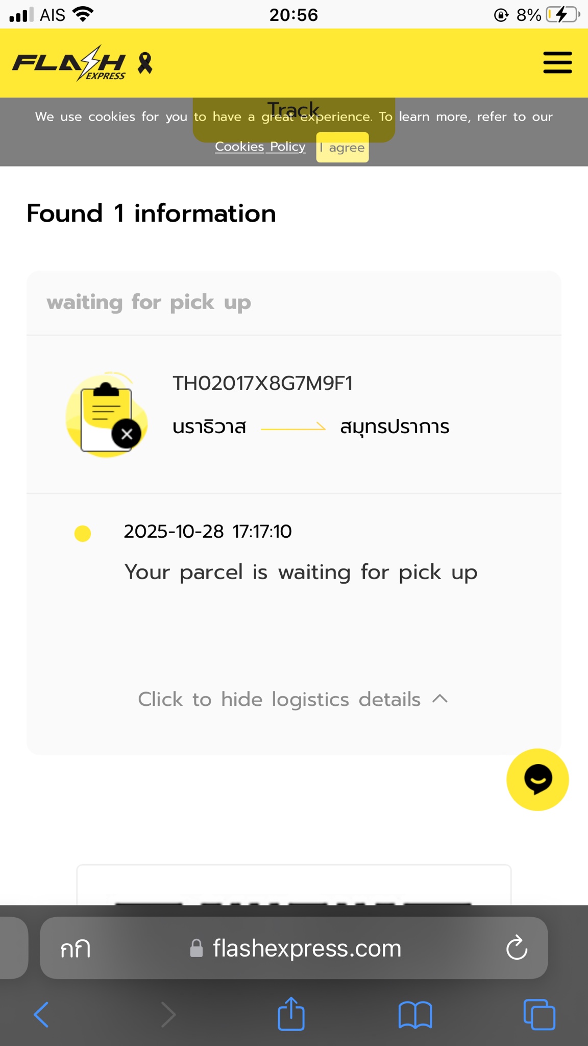 พัสดุ flash ขึ้นไม่เข้ารับพัสดุหลายวันแล้วครับ TH02017X8G7M9F1