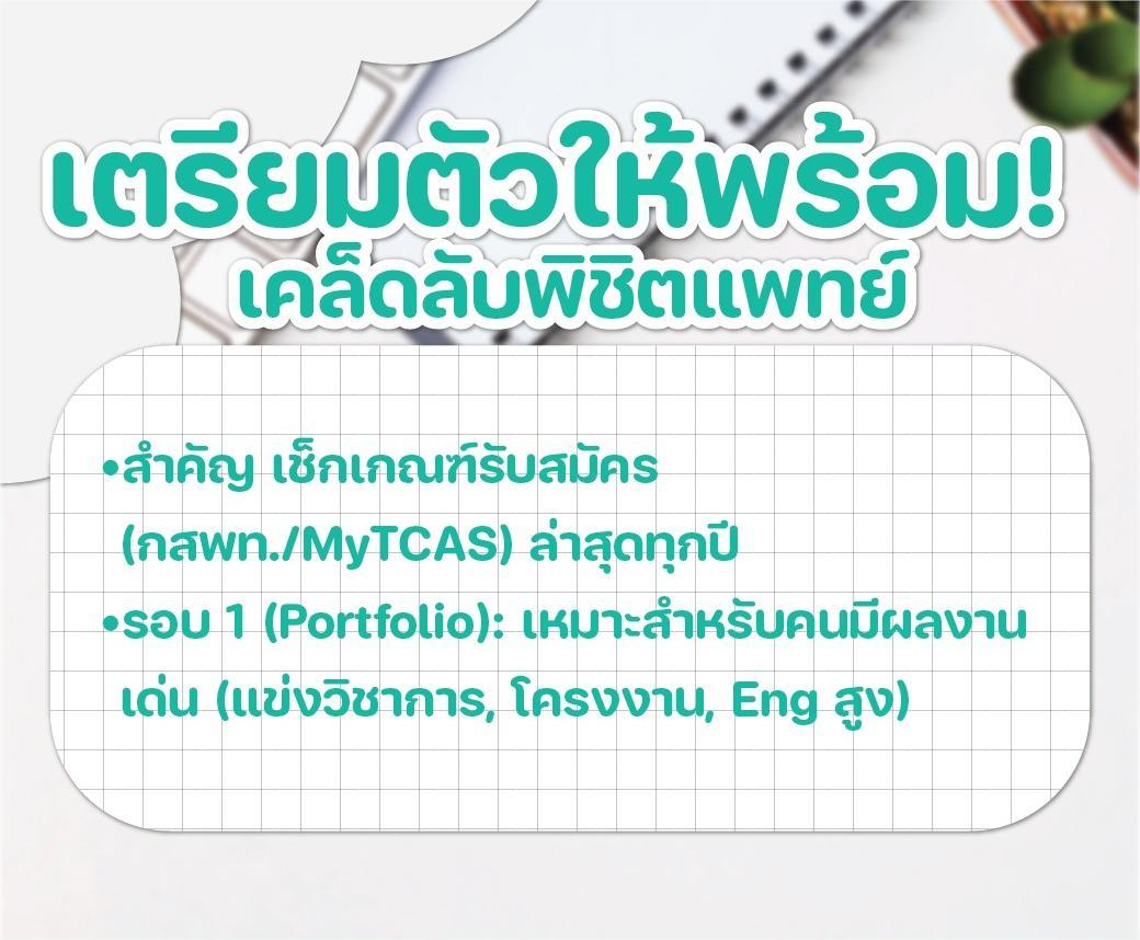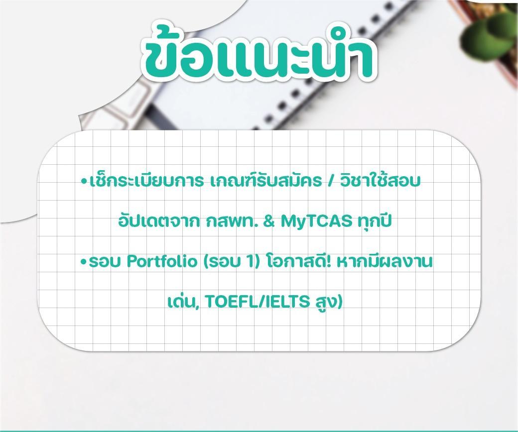 เช็กเกณฑ์ให้ชัวร์! สิ่งสำคัญที่สุดคือการ ตรวจสอบระเบียบการ/เกณฑ์รับสมัคร และวิชาที่ใช้สอบจาก กสพท. & MyTCAS ที่อัปเดตล่าสุดทุกปี เนื่องจากเกณฑ์อาจมีการเปลี่ยนแปลง!